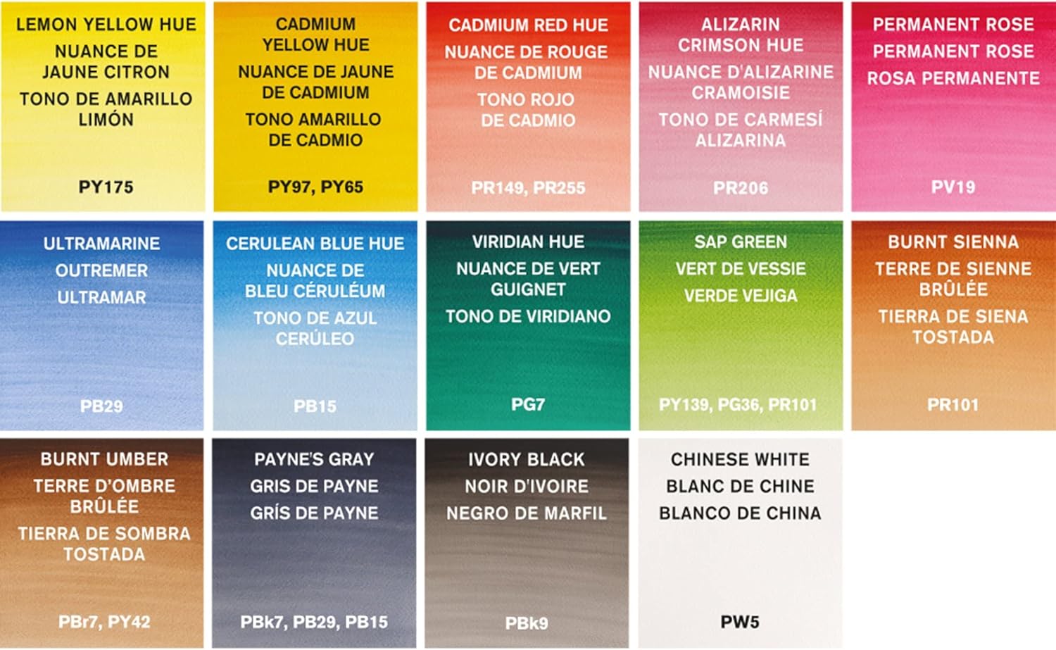 - This water colour set contains a Cotman Series 111 No.5 brush and 14 Cotman Water Colour half pans: Lemon Yellow Hue, Cadmium Yellow Hue, Cadmium Red Pale Hue, Cadmium Red Hue, Alizarin Crimson Hue, Purple Lake, Ultramarine, Cerulean Blue Hue, Sap Green, Viridian Hue, Yellow Ochre, Burnt Sienna, Burnt Umber, Chinese White.