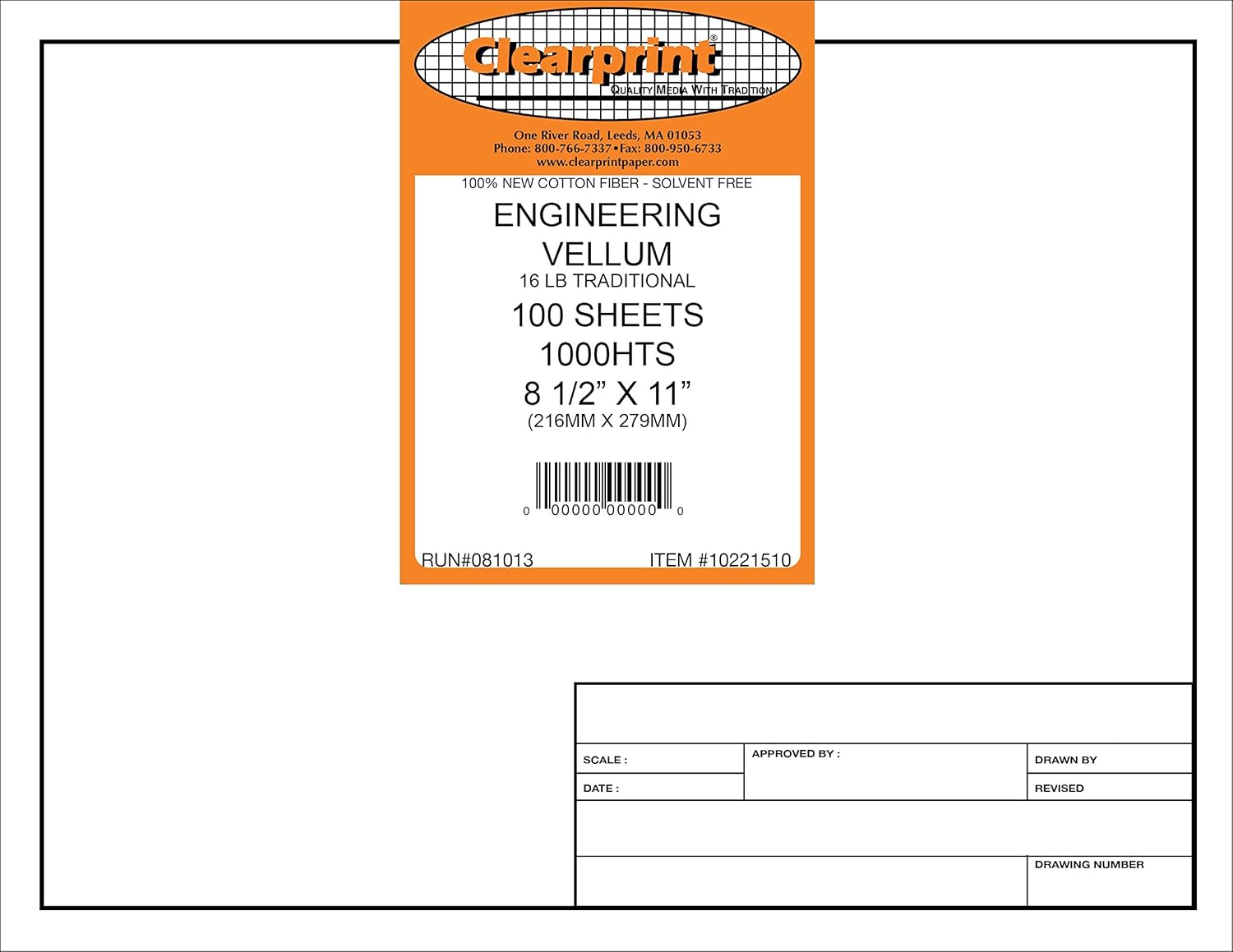 Clearprint 8-1/2" x 11" 1000H Design Vellum Sheets with Engineer Title Block, 16 lb., 100% Cotton, 100 Sheets Per Pack, 1 Each
