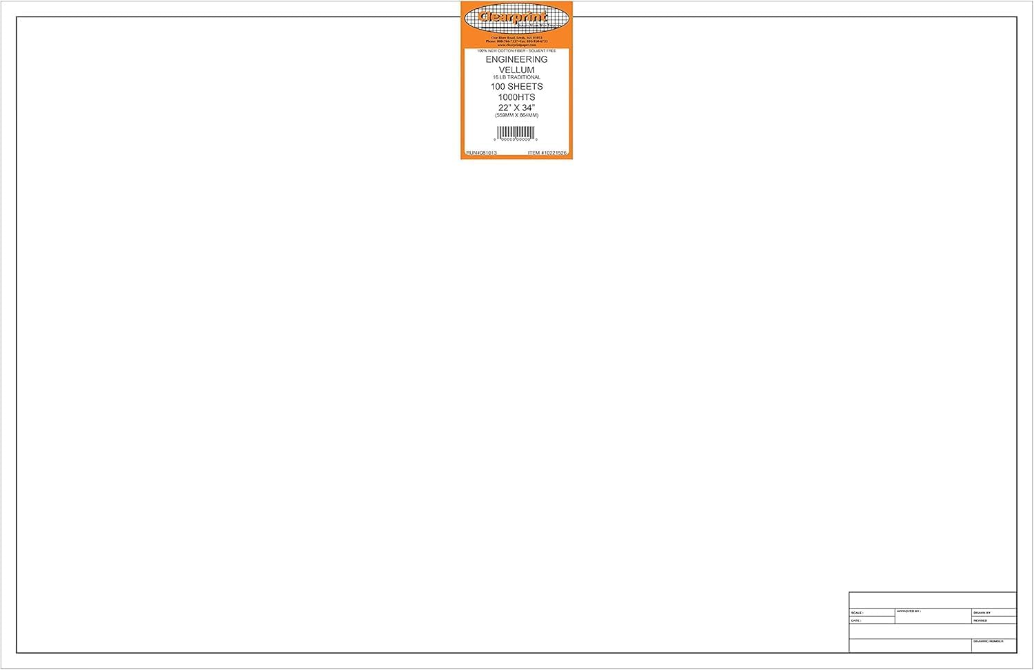 Clearprint 22" x 34" 1000H Design Vellum Sheets with Engineer Title Block, 16 lb., 100% Cotton, 100 Sheets Per Pack, 1 Each
