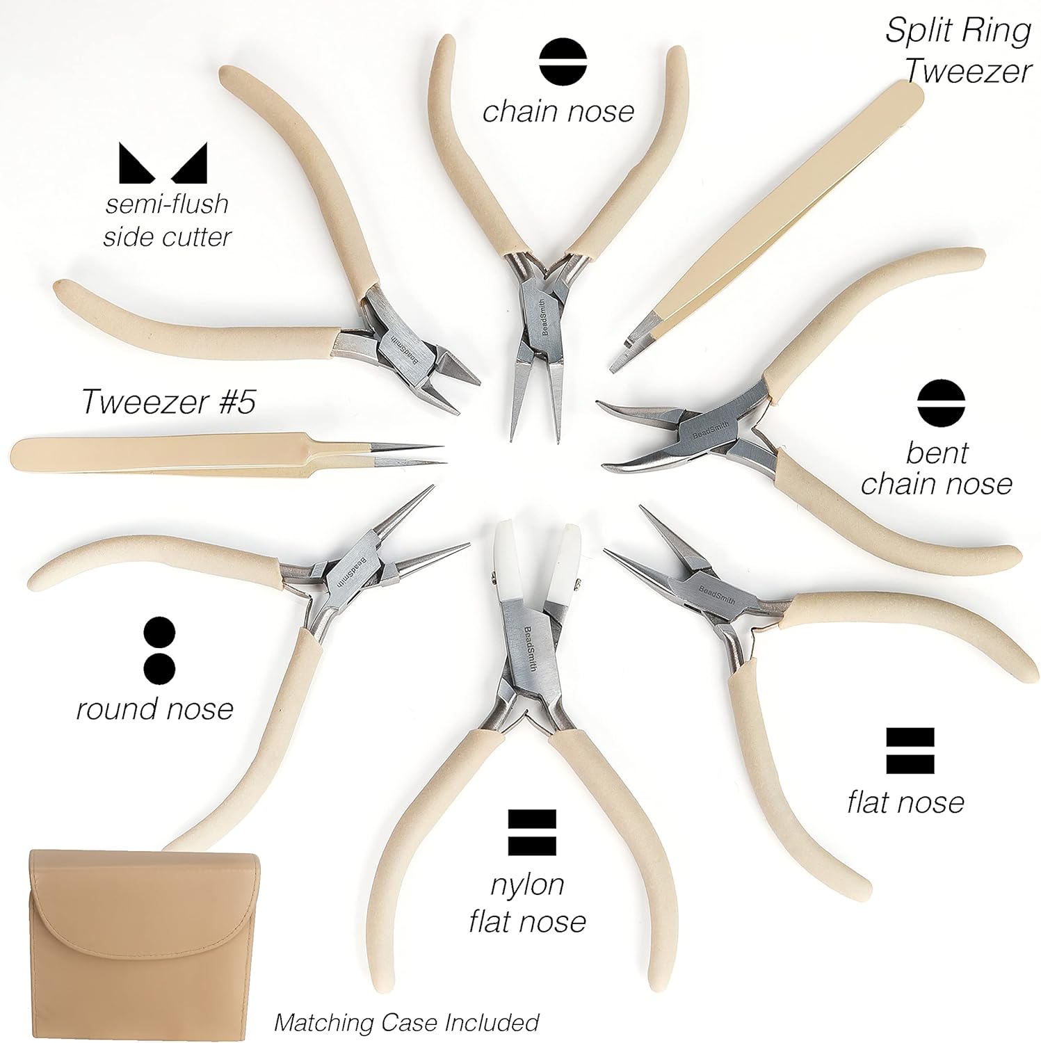 - 8 PIECES: This set of slimline pliers include a chain nose, bent chain nose, flat nose, nylon flat nose, round nose and semi-flush cutter. There is a split ring tweezer and #5 tweezer in the kit as well.