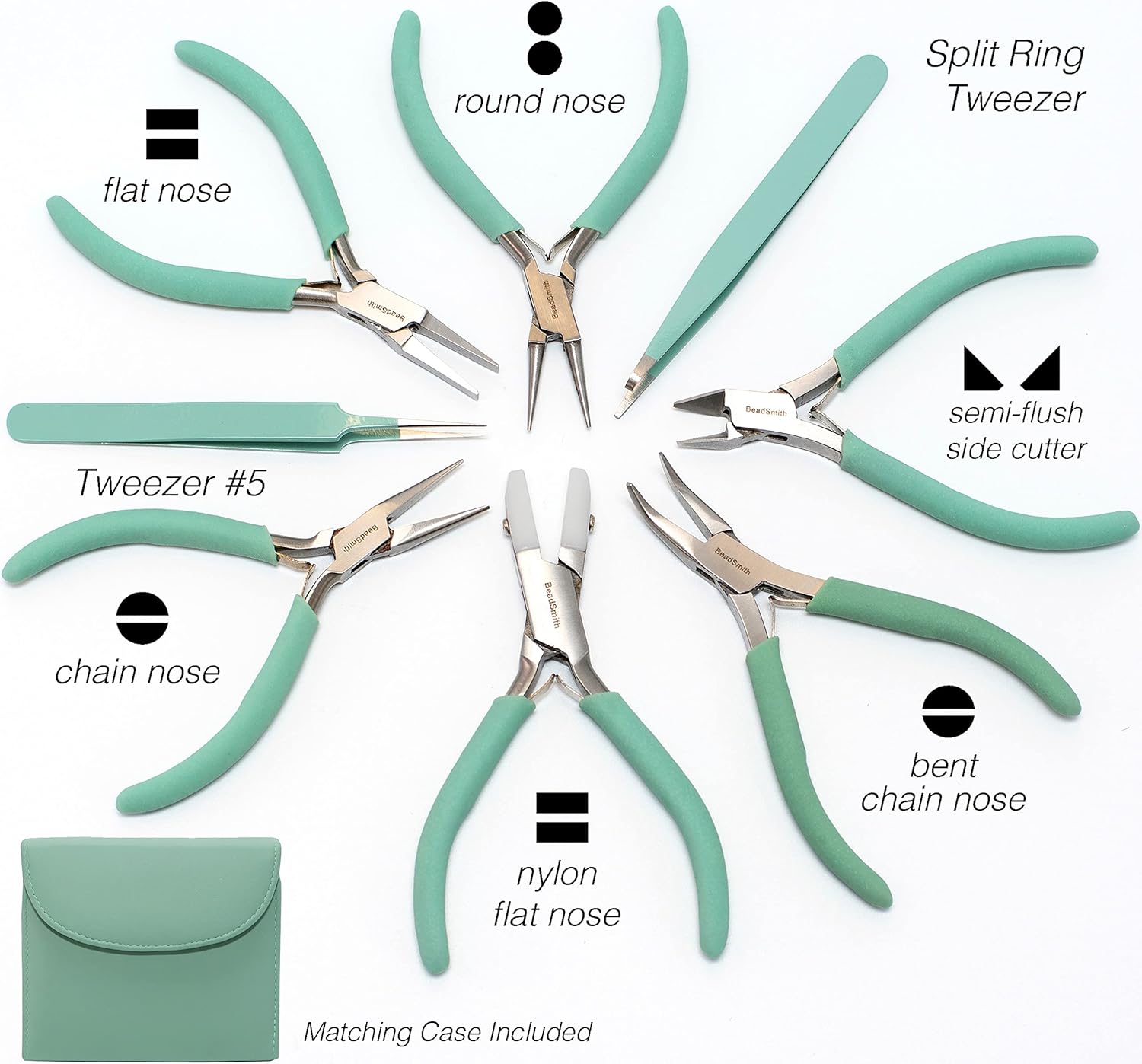 - 8 PIECES: This set of slimline pliers include a chain nose, bent chain nose, flat nose, nylon flat nose, round nose and semi-flush cutter. There is a split ring tweezer and #5 tweezer in the kit as well.