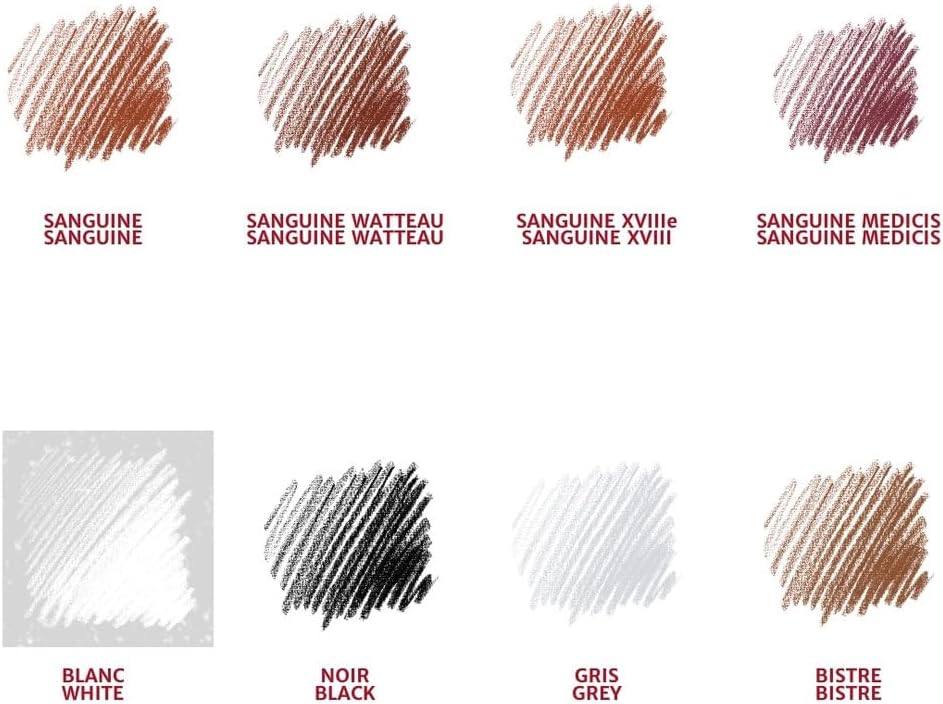 - This box contains 12 colors: bistre, Medici red chalk, Watteau red chalk, XVIIIth red chalk, red chalk, white B, gray, black HB, 2x black B, 2x black 2B.