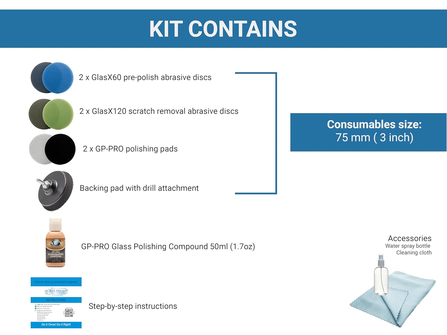 - ✅ KIT CONTENT: 3'' (75mm) Backing pad with drill attachment | 3” (75mm) Felt polishing pads (2 Pads) | 3'' (75mm) xNet Blue abrasives (2 Discs) | 3'' (75mm) xNet Green abrasives (2 Discs) | 1.7oz (50ml) GP-PRO Glass polishing compound | 3.4oz (100ml) Water spray bottle | Glass cleaning cloth | Step by Step instructions with images