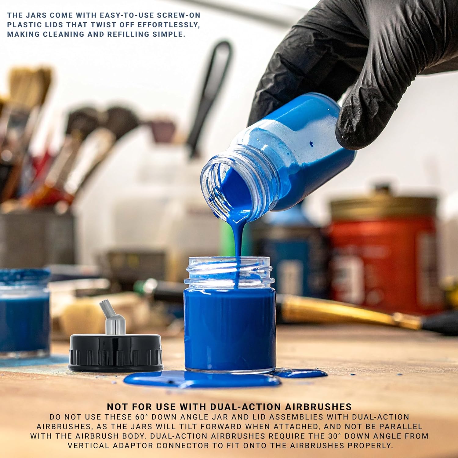 - Pack of 10 Master Airbrush Model TB-003 Jar and Lid Assemblies. Empty 3/4 Ounce (22cc) Glass Jar Bottles with a 60° Down Angle Adaptor Lid Assembly. For use with siphon feed single-action airbrushes.