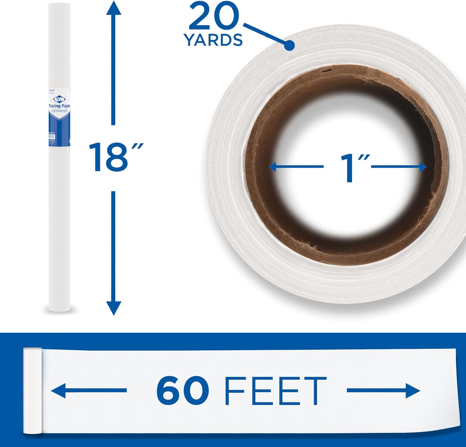 ALVIN 55W-C Lightweight Tracing Paper Roll, White, Suitable with Ink, Charcoal, Felt Tip Pen, for Sketching or Detailing - 18 Inches, 20 Yards, 1-inch Core
