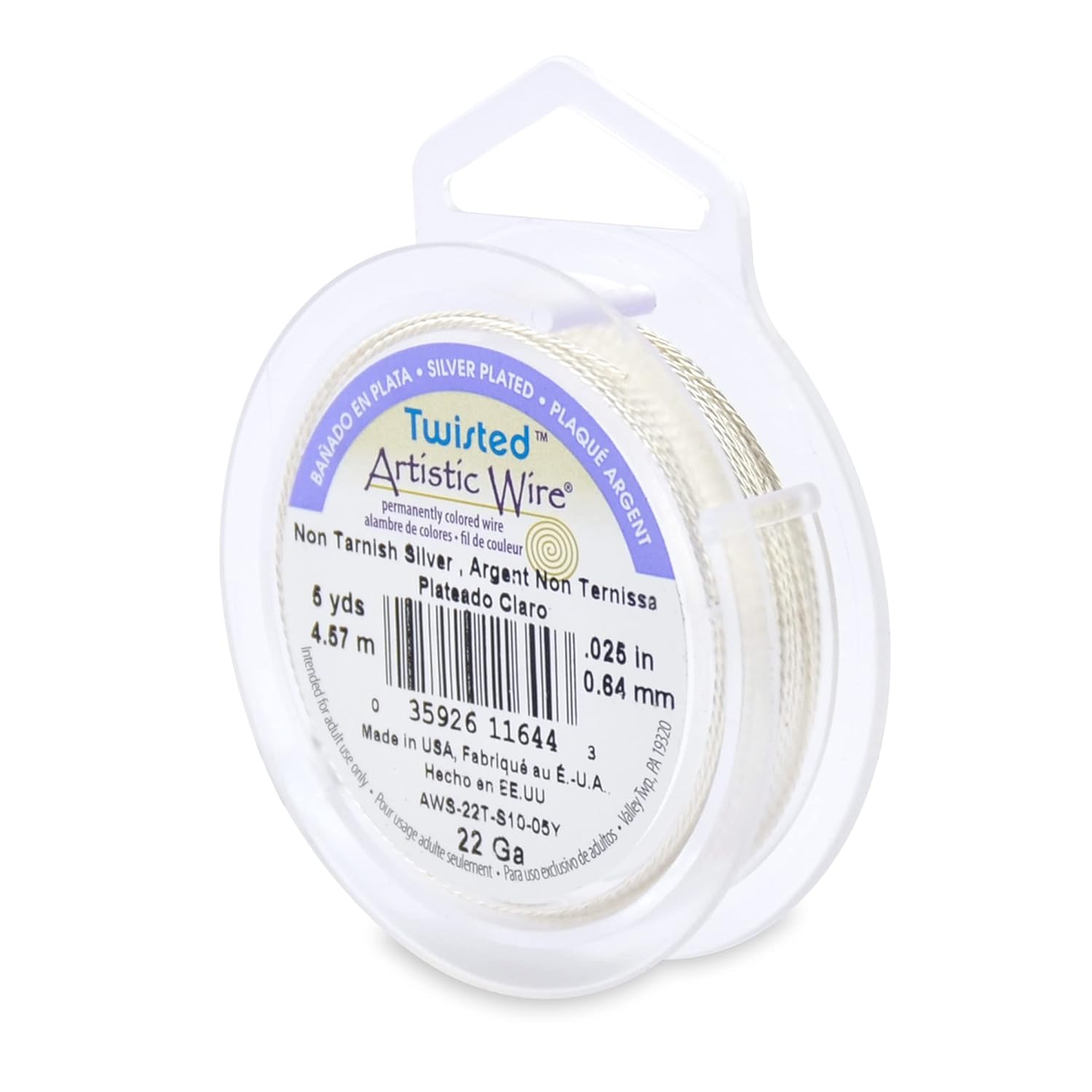 Artistic Wire, 22 Gauge / .64 mm Silver Plated Tarnish Resistant Colored Copper Craft Wire, Round Twist, Tarnish Resistant Silver, 5 yd / 4.57 m