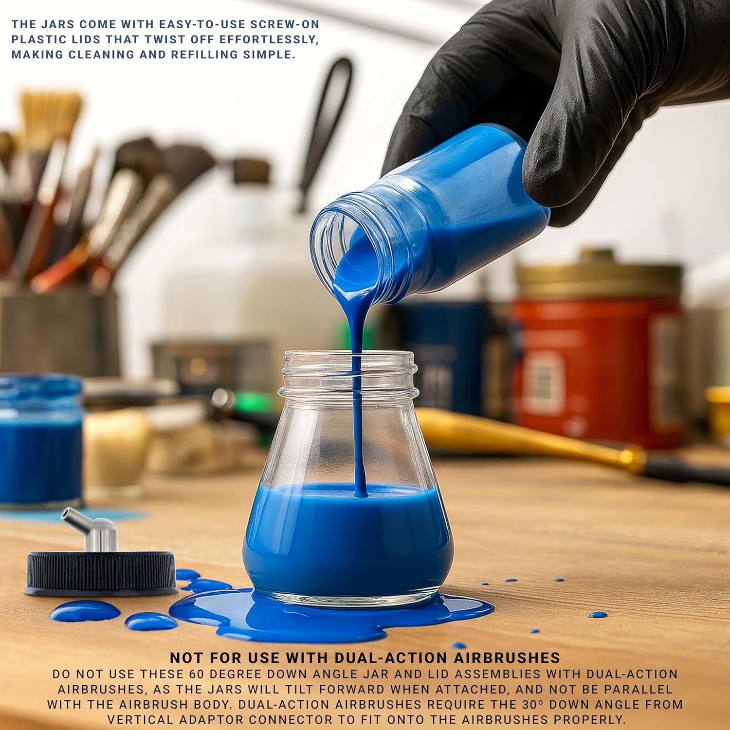 - Not For Use with Dual-Action Airbrushes: Do not use these 60° down angle jar and lid assemblies with dual-action airbrushes, as the jars will tilt forward when attached, and not be parallel with the airbrush body. Dual-action airbrushes require the 30° down angle from vertical adaptor connector to fit onto the airbrushes properly