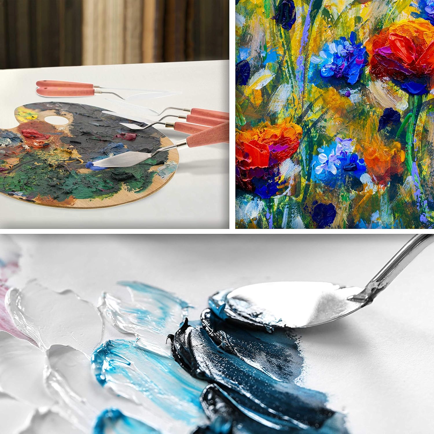 - Durable Stainless Steel Blades: Each paint knife for acrylic painting boasts a sturdy yet flexible stainless steel blade that resists corrosion, allowing for smooth application, scratching, scumbling, and mixing of thick paints.