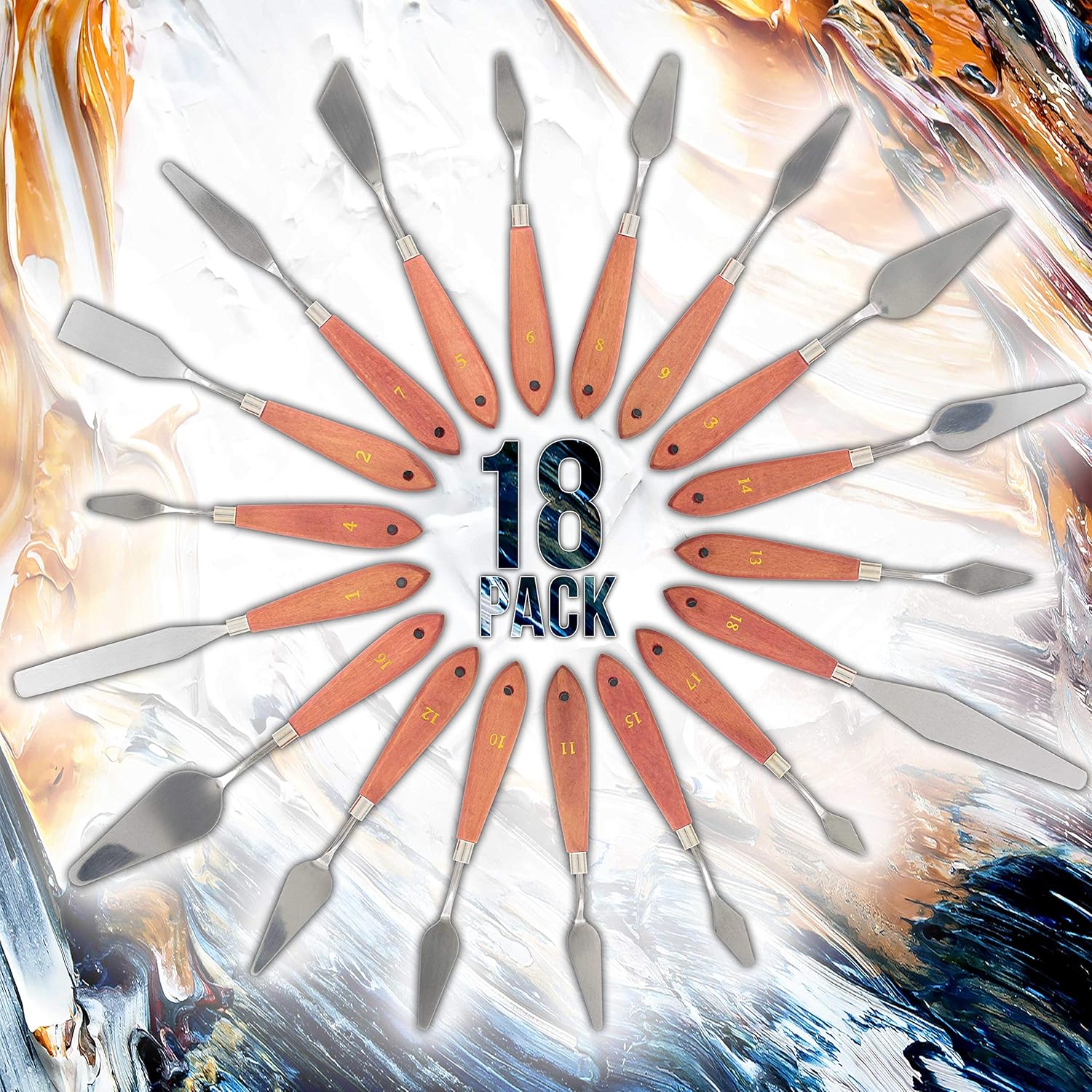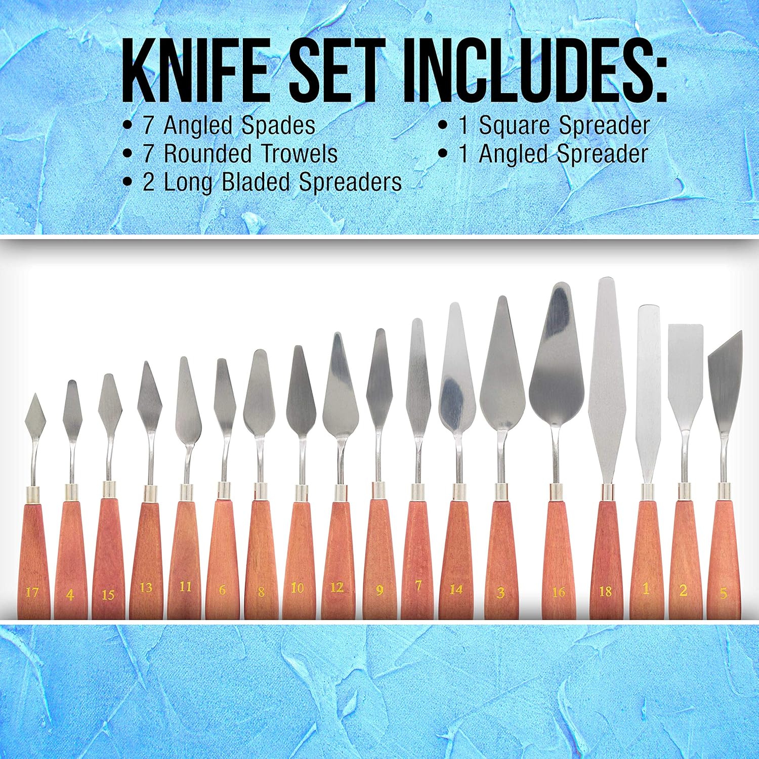 - Complete 18-Piece Set: Get a premium collection of palette knives for acrylic painting and oil work, featuring 7 angled spades, 7 rounded trowels, 1 square spreader, 1 angled spreader, and 2 long-bladed spreaders for diverse techniques.