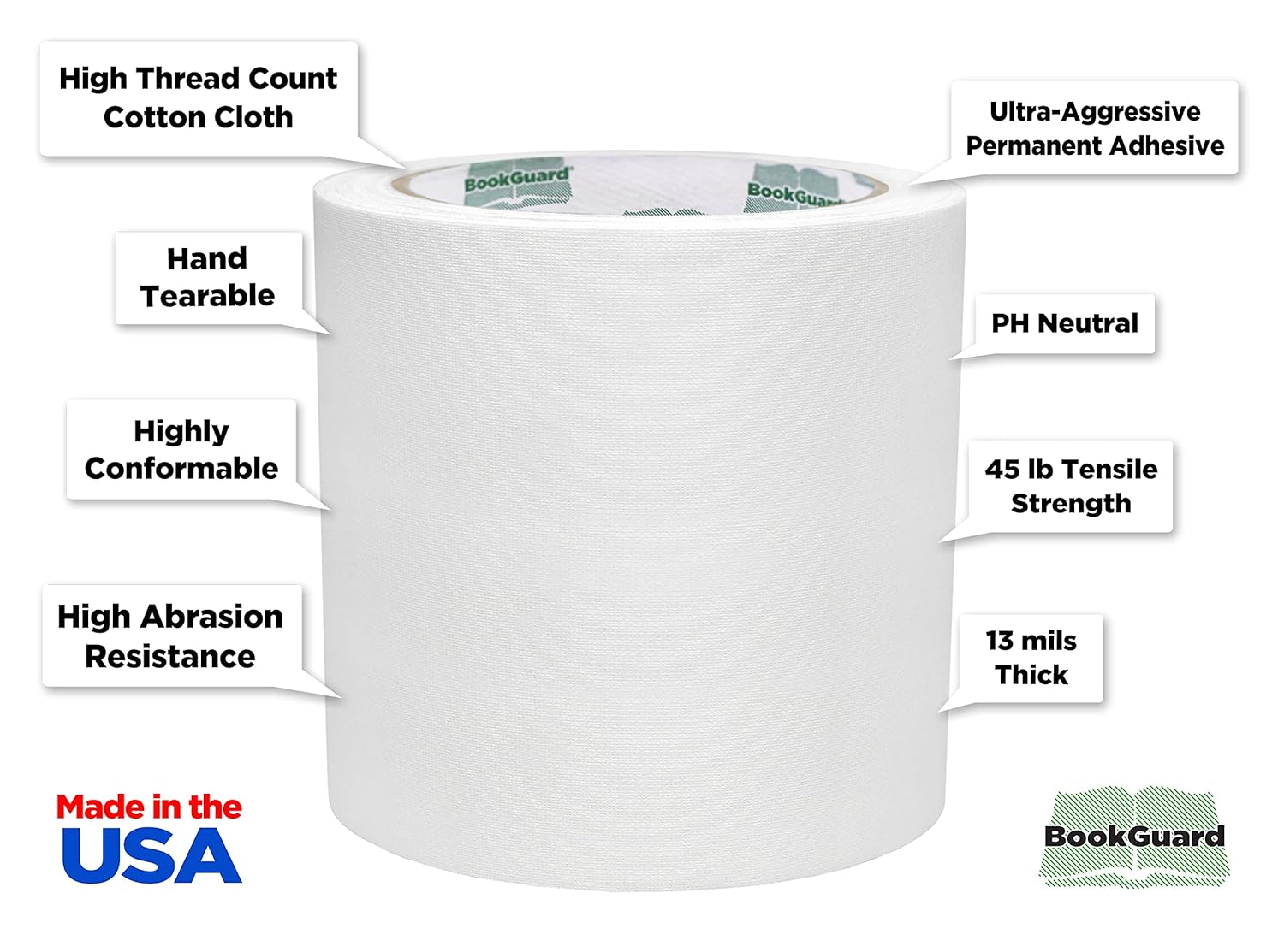 BookGuard 4 inch Premium Bookbinding Repair Cloth Tape, 15 Yard Roll, White