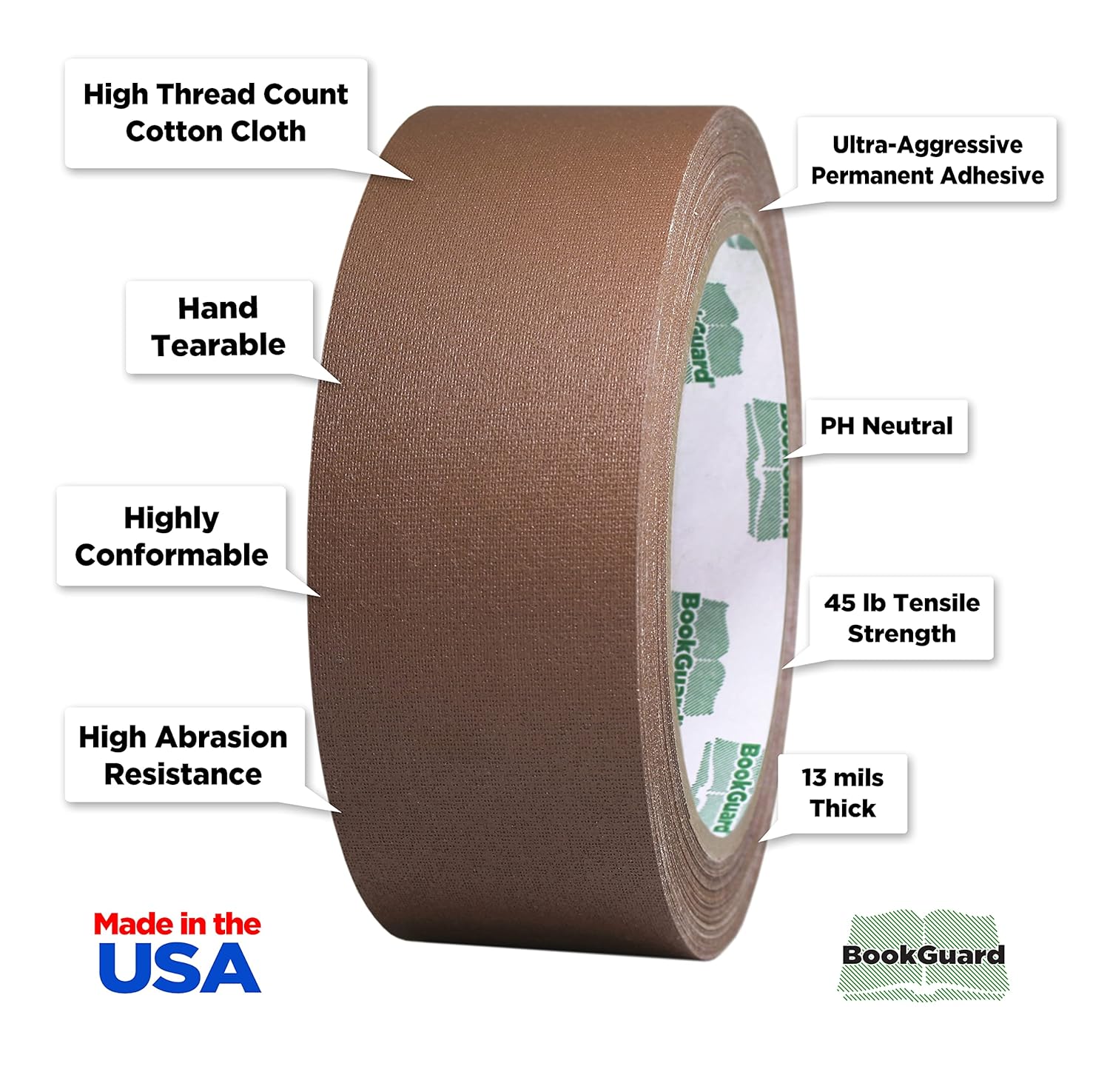 BookGuard 1-1/2 Inch Vinyl-Coated Cotton Cloth Bookbinding Repair Tape, 15 Yard Roll, Light Brown
