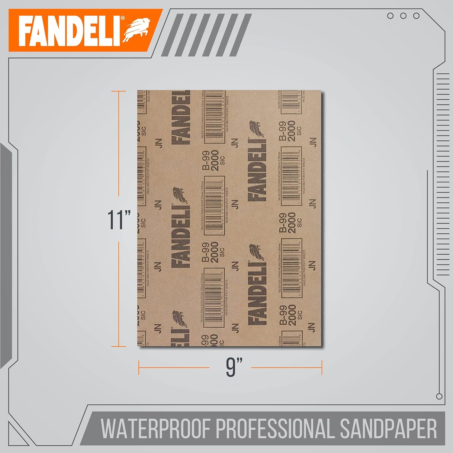 Fandeli | Waterproof Sandpaper | 2000 Grit | 25 Sheets 9'' x 11'' | For Car Polishing, Wooden Furniture Sanding and Metal Sanding | Water Resistant