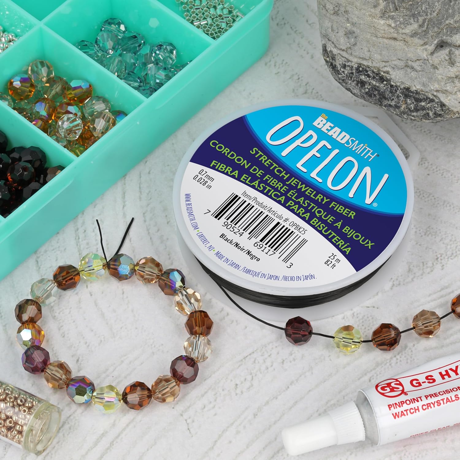 - OPELON FIBER: This stretchy jewelry string is made of a black fibrous material and measures 0.7 mm in diameter. The 25 meters are wound on a spool that is secured with a clear plastic clip to keep your cord secure and organized.