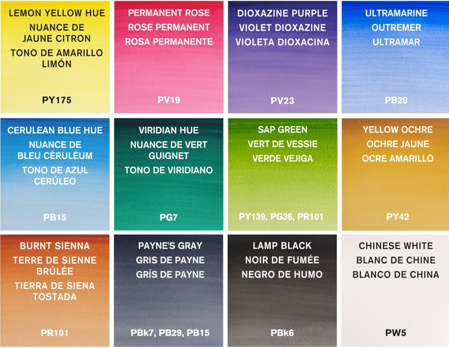 - Set contains Payne's Gray, Lamp Black, Chinese White, Lemon Yellow Hue, Alizarin Crimson Hue, Ultramarine, Burnt Sienna, Yellow Ochre, Sap Green, Viridian Hue, Turquoise, Dioxazine Violet, mixing palette and brush.