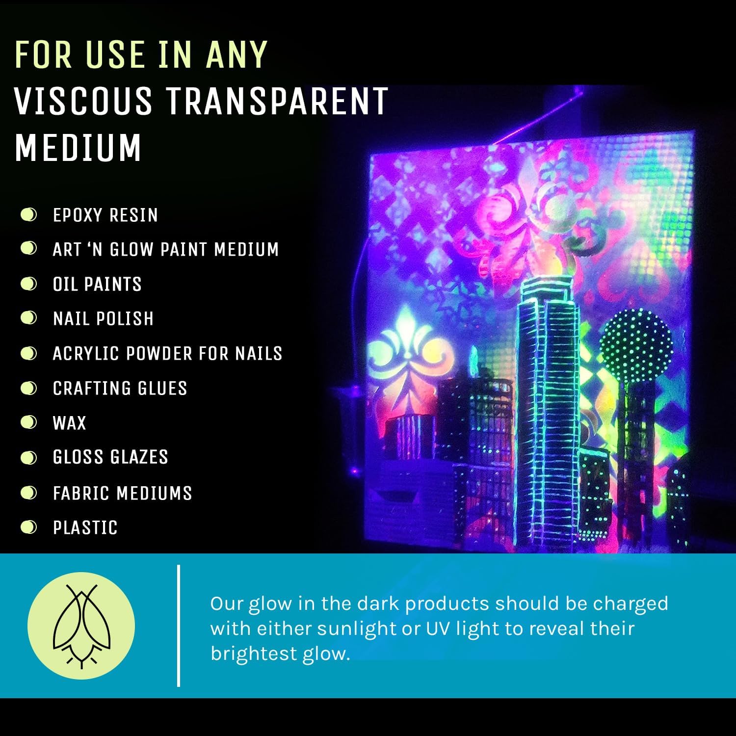 - With each order, you will receive the listed portion of Art 'N Glow's coated strontium aluminate glow powder, renowned as the brightest and longest-lasting technology in the glow-in-the-dark market. Our exceptional glow pigment comes thoughtfully packaged in a convenient, reclosable zip lock bag, ensuring ease of use and storage. Enjoy the freedom to explore your artistic endeavors with confidence using our versatile glow powders.