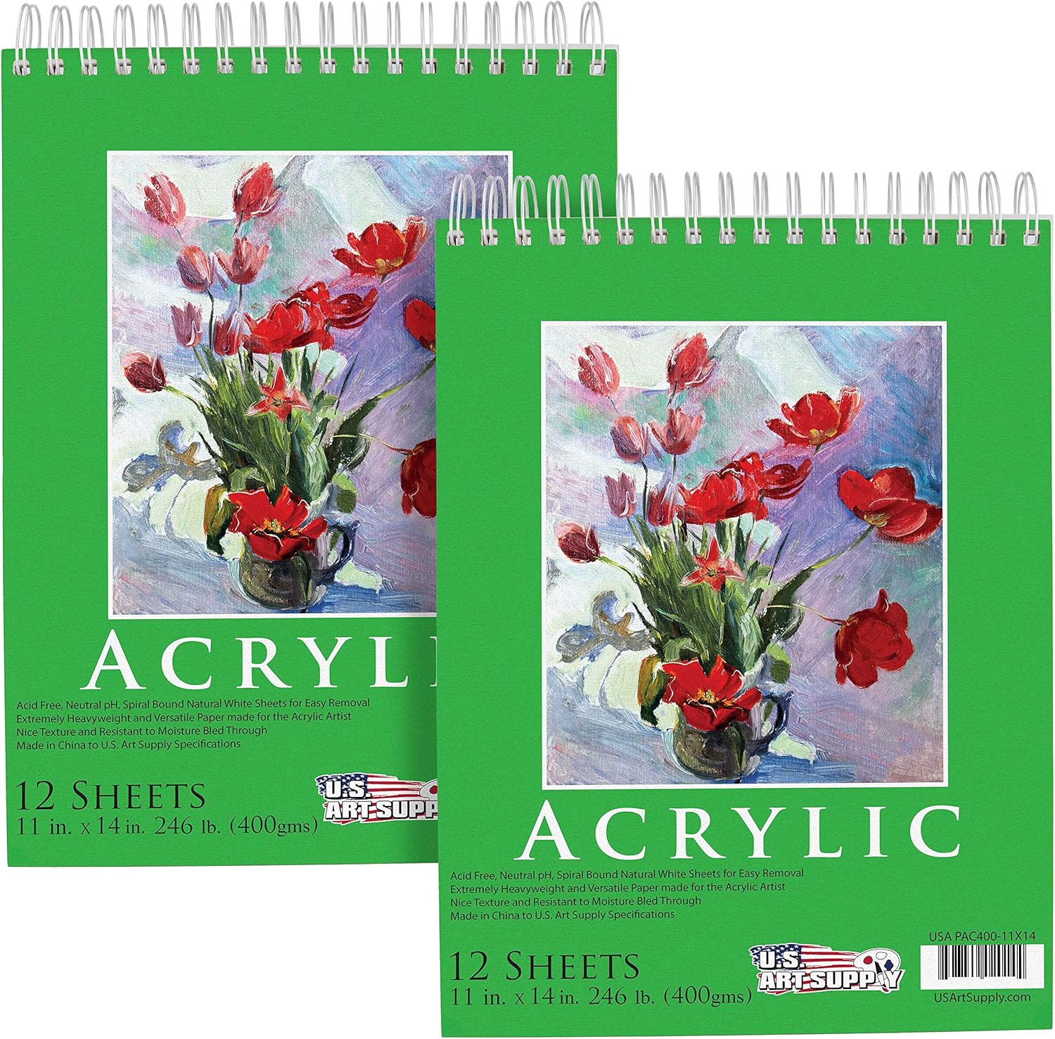 U.S. Art Supply 11x14 Premium Heavy-Weight Acrylic Painting Paper Pad, 246lb (400gsm), 2 Pack, 12 Sheets, Spiral Bound, for Acrylic Paint