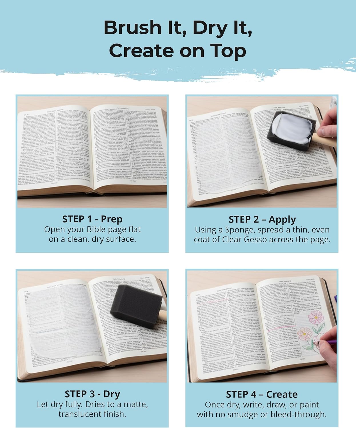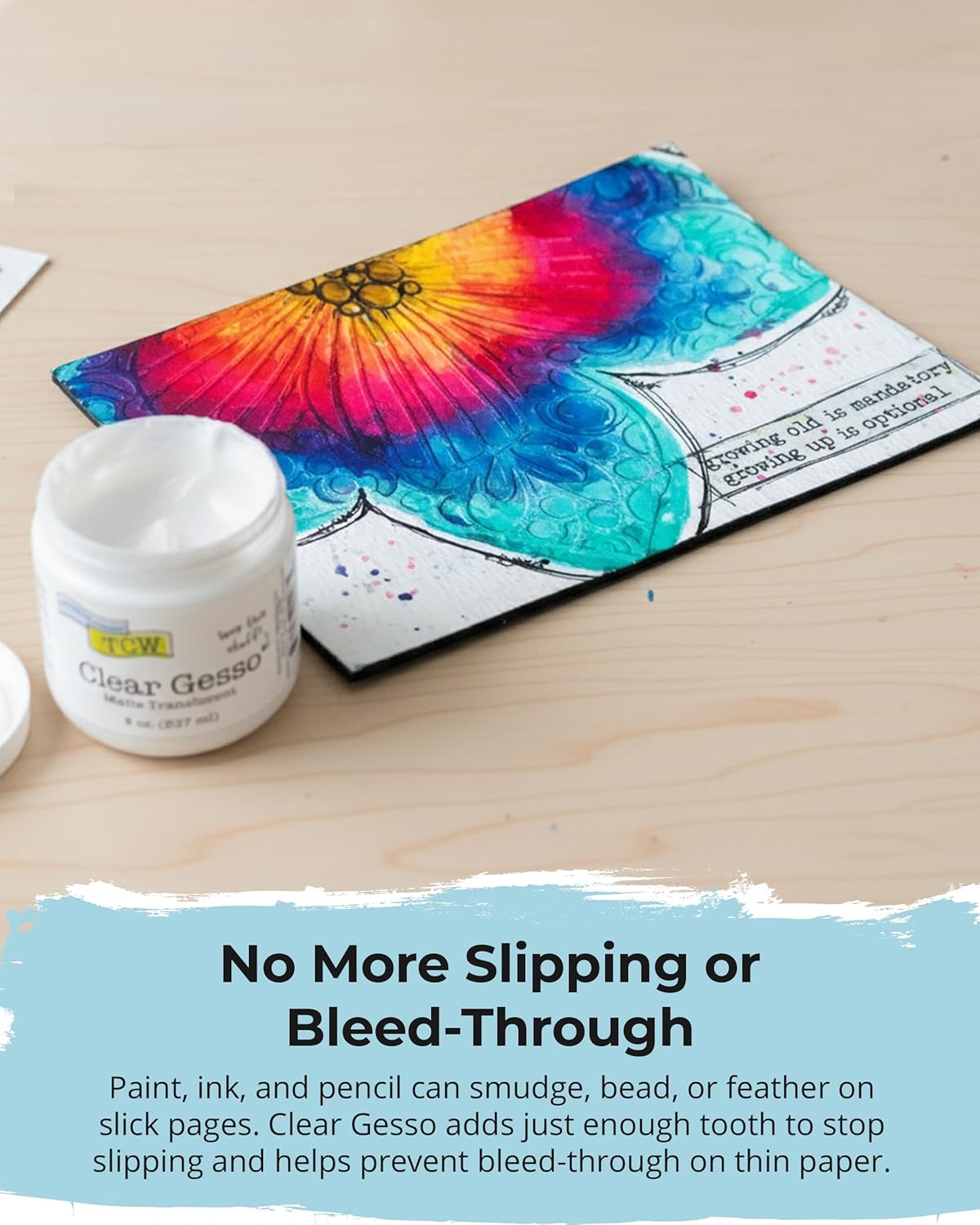 - STOP BLEED-THROUGH IN ITS TRACKS - Easy to apply with a brush or palette knife, this clear gesso delivers smooth, one-coat coverage that helps prevent bleed-through and feathering when using watercolor, gel pens, pastels, or markers.