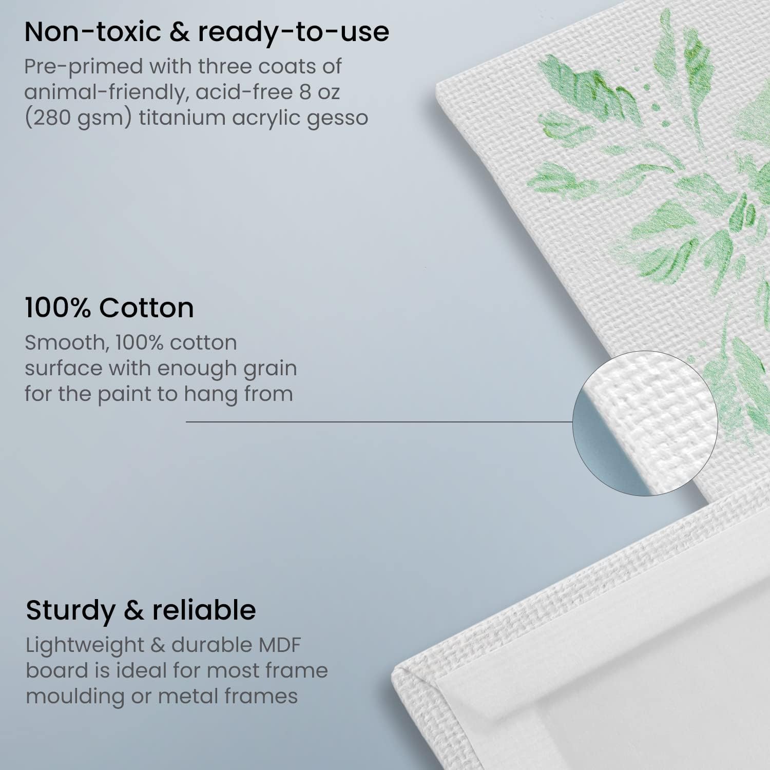 - Primed and Ready to Go: Each canvas is pre-coated with 8 oz. of acid-free acrylic titanium gesso, offering a smooth, ready-to-paint surface that lets you start creating immediately after unwrapping.