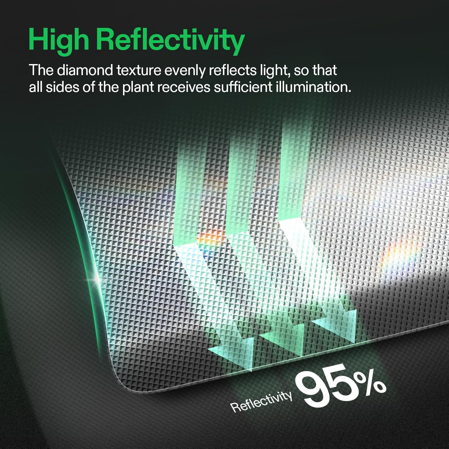 - 92%-97% Reflective Rate: The embedded diamond texture improves the reflectivity to 92%-97%; Our 6 mil PET film coated with aluminum paint increases the intensity and spreads light more evenly, and will not be affected by water and humidity