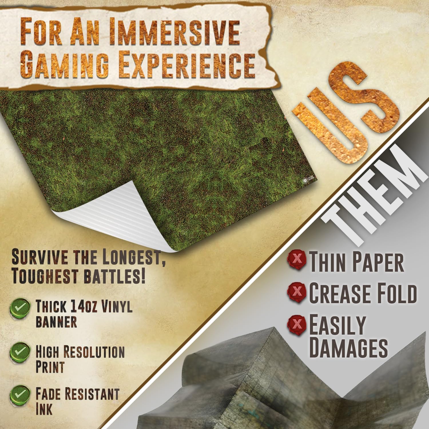 - ENRICH YOUR GAMING EXPERIENCE - A heavy-duty gaming mat, made to handle plenty of epic journeys and battles! Transform your tabletop or gaming surface quickly and easily with our battle gaming field mat. Each mat is carefully crafted with detailed terrain making it a valued addition to your next quest!
