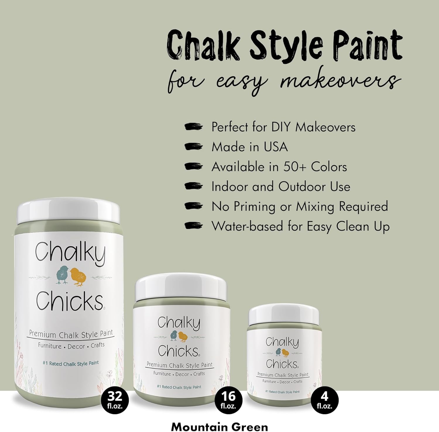 Chalky Chicks All-in-One Chalk Paint for Furniture or Cabinet -32FlOz-Matte Finish Mountain Green (Sage Green) for Metal, Wood Furniture Paint - No Sanding All-in-One for Home Decor & Crafts, USA Made