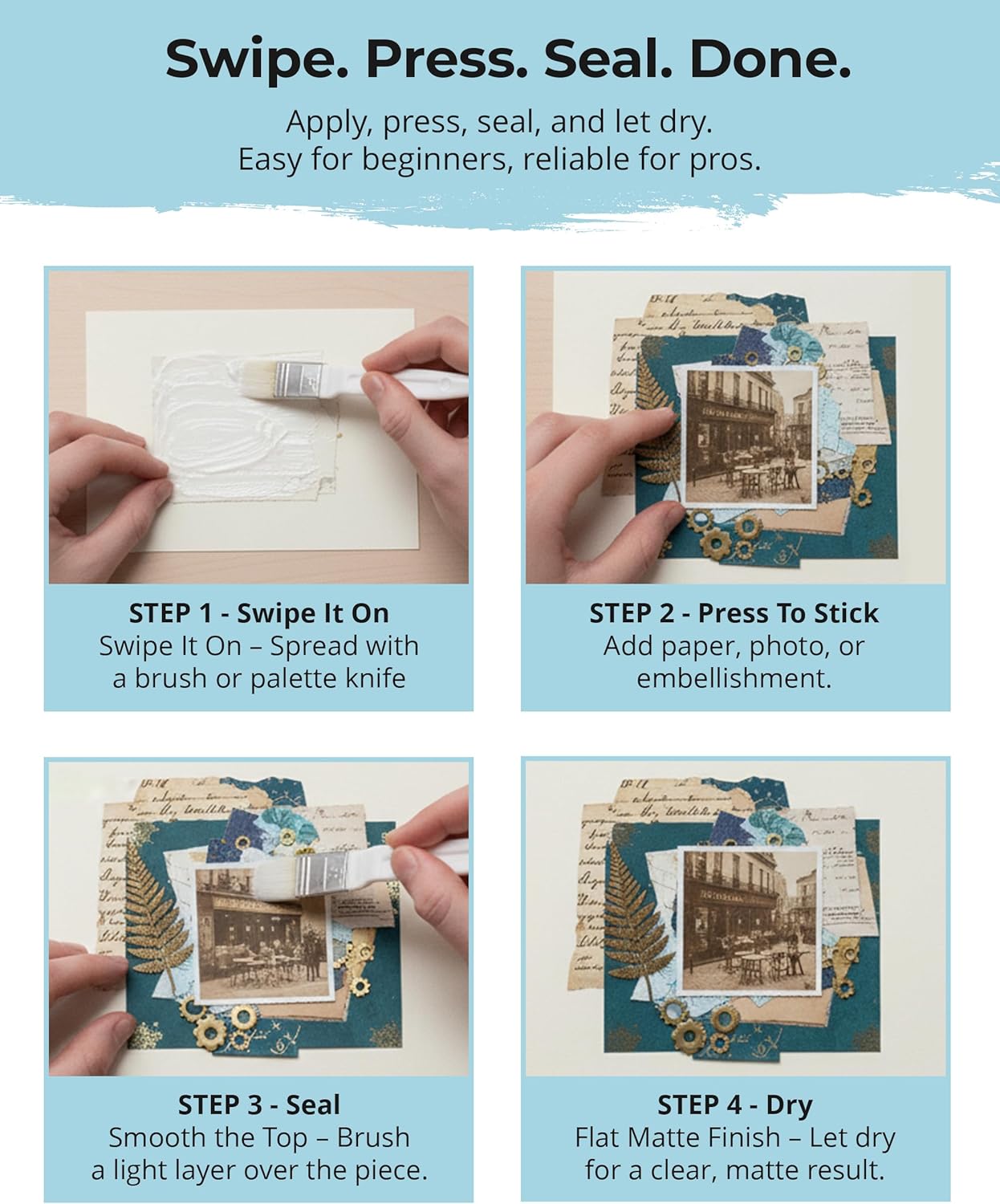 - DRIES MATTE. STAYS INVISIBLE - Thick gel dries clear and matte, preserving layered papers, watercolor, and ephemera without shine or wrinkles. Great for collage and easy to apply with a palette knife.