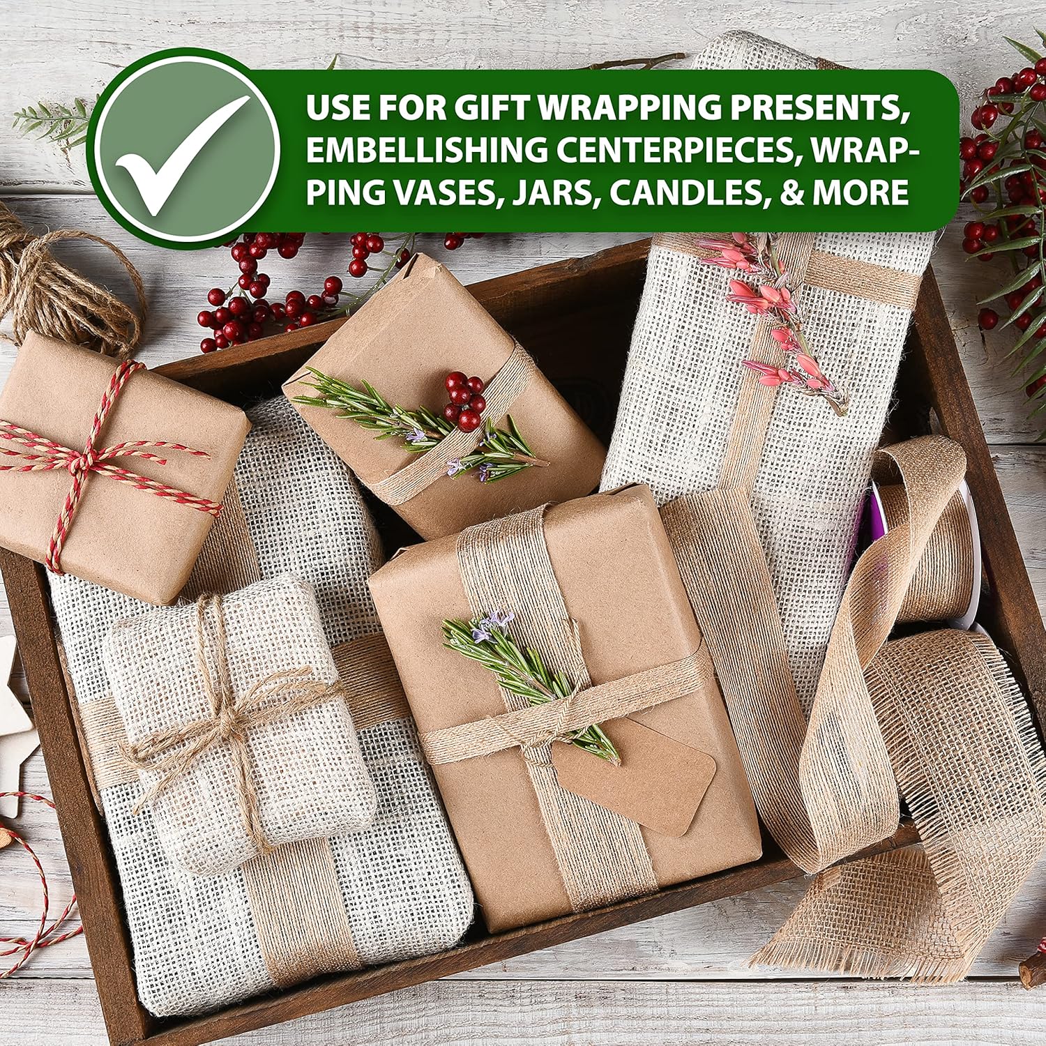 - Natural Burlap Ribbon: Compared to other jute burlap ribbons, our rustic burlaps ribbon with a fray & shed-resistant hemmed edges is made from thicker yellow burlap fabric. The indoor & outdoor colored burlap crafts ribbon is colorfast and will not bleed.