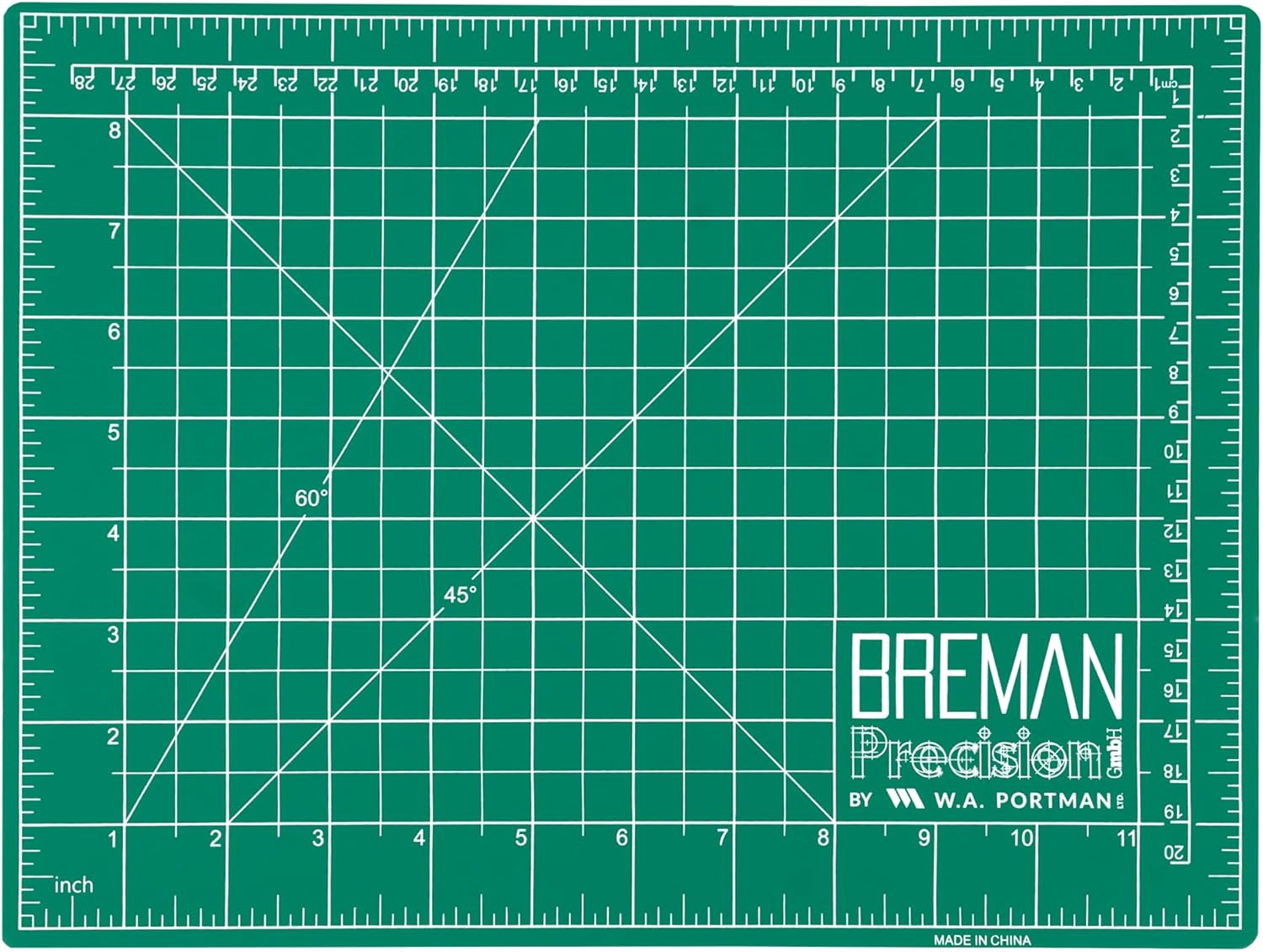 - Full-Size Fabric Cutting Mat - Breman Precision’s cutting board for crafts offers a 9x12 inch surface with a 1/4 inch border, featuring 1 and 1/2 inch grids, 1/8 inch ruler marks, and 45° and 60° guides for precise cuts. It doubles as a sewing mat and also functions well as a measuring mat