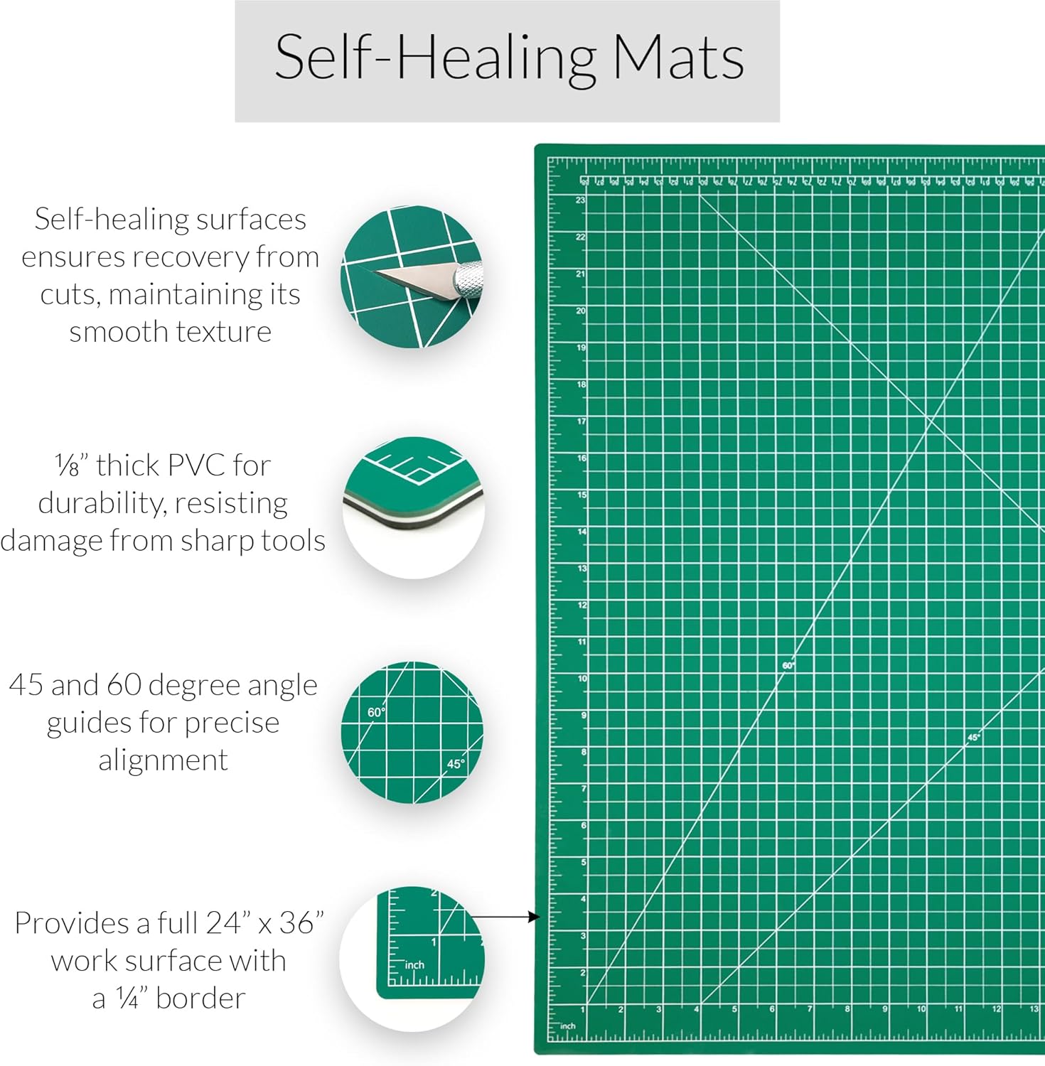 - Self-Healing Cutting Mat - This revolutionary self healing mat feature allows the vinyl to withstand craft knife cuts and fabric rotary cutter slices. This hobby mat prevents snags or bumps and even reseals surface marks over time, making it a great addition to any sewing kit, craft supplies, or collection of cutting mats for sewing