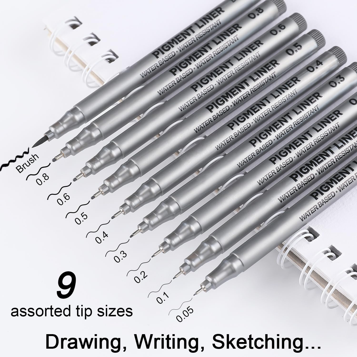- 9 Black Drawing Pens - 9 assorted and unique nib sizes 0.2 mm (005), 0.25 mm (01), 0.3 mm (02), 0.35 mm (03), 0.4 mm (04), 0.45 mm (05), 0.5 mm (06), 0.6 mm (08) and 1 soft brush tip (Brush). It allows for varying line weights and precision when technical drawing or writing. Ideal for stippling, bold lettering, illustrating, journaling, doodling, sketching, and outlining