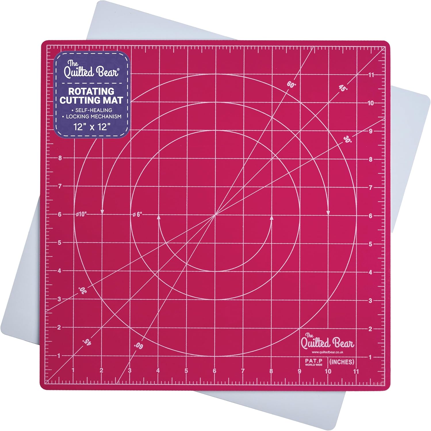The Quilted Bear Rotating Cutting Mat 12" x 12" - Locking & Rotating Self Healing Cutting Board for Sewing, Fabric & Quilting - 360 Degree Sewing Supplies Mat for Craft Table (Pink)