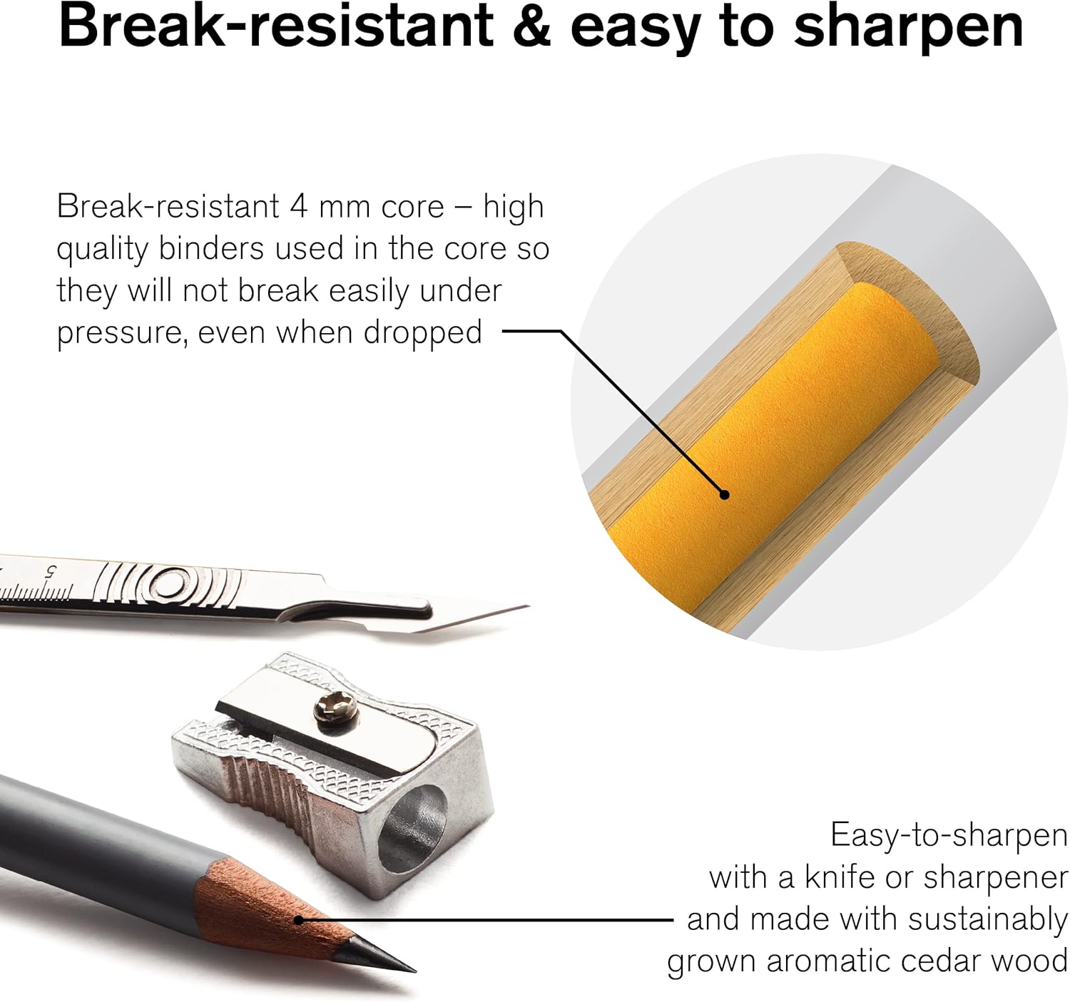 - Round, cedar wood barrel with break-resistant 3.7mm core that sharpens cleanly to a point