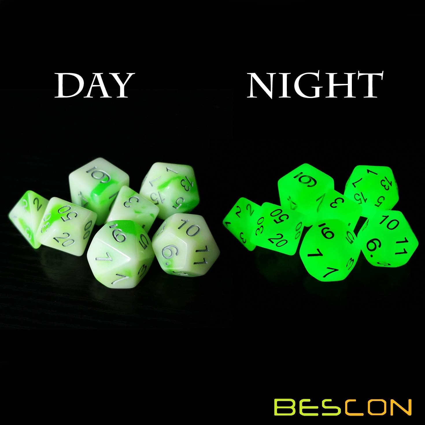 - This jade like dice set is really charming, yes it is one of the Bescon's most beautiful dice set. But they are even more beautiful in dark! Yes they are unique LUMINOUS JADE dice!