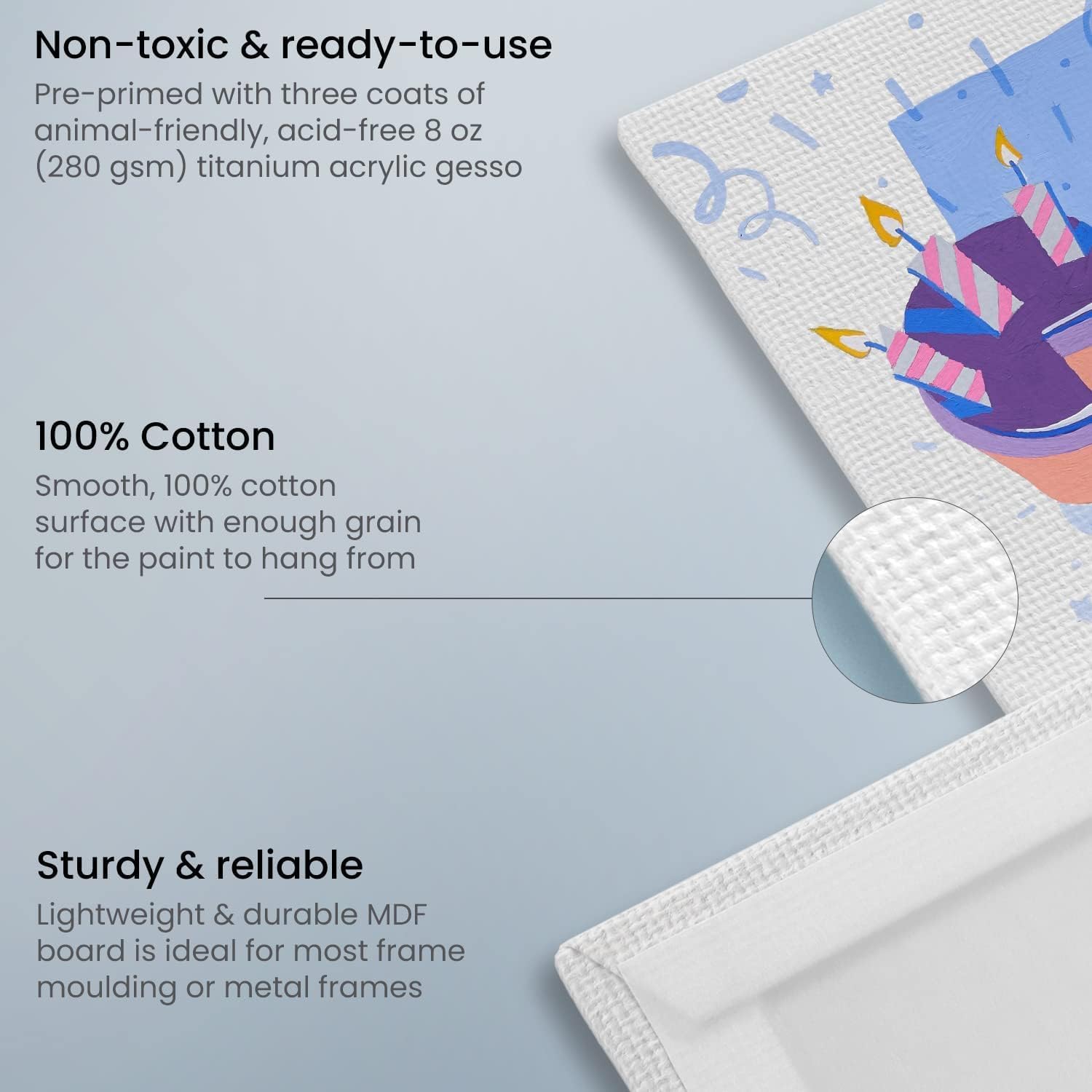- Cotton Art Surface for Painting: Our 8x8 canvas boards are made from cotton, offering a smooth and durable surface for painting with oils, acrylics, gouache, and tempera.