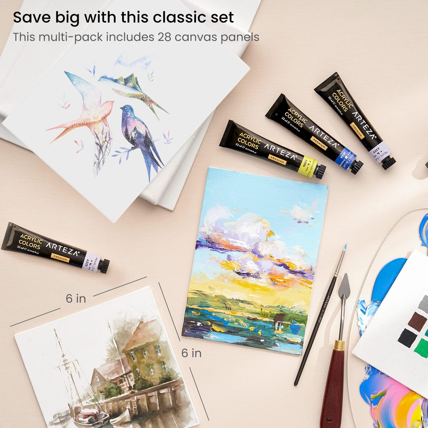 ARTEZA Canvas Boards for Painting, 6 x 6 Inches, Pack of 28, Blank White Small Canvas Panels for Acrylic, Oil and Gouache Painting