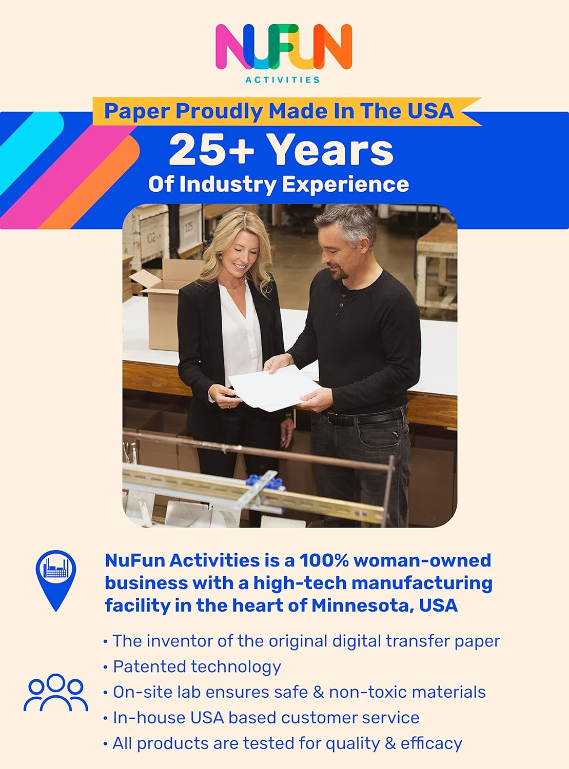 - Pack of 6 Iron On T-Shirt Printing Paper in 8.5"X11” for Light and White T-Shirts. NuFun’s patented technology has been used for 25+ years by both professionals and amateurs to create custom designs for family events, businesses, promotional gifts, and more.