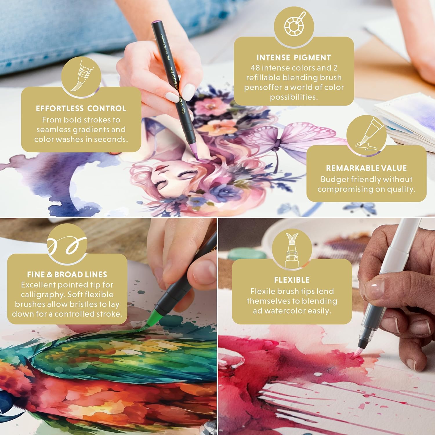 DOODLE HOG 48 Premium Watercolor Pens +2 Highly Blendable Markers, Real Brush Tip Watercolor Markers, Art Supplies for Adults, 48 Colors Gift Box