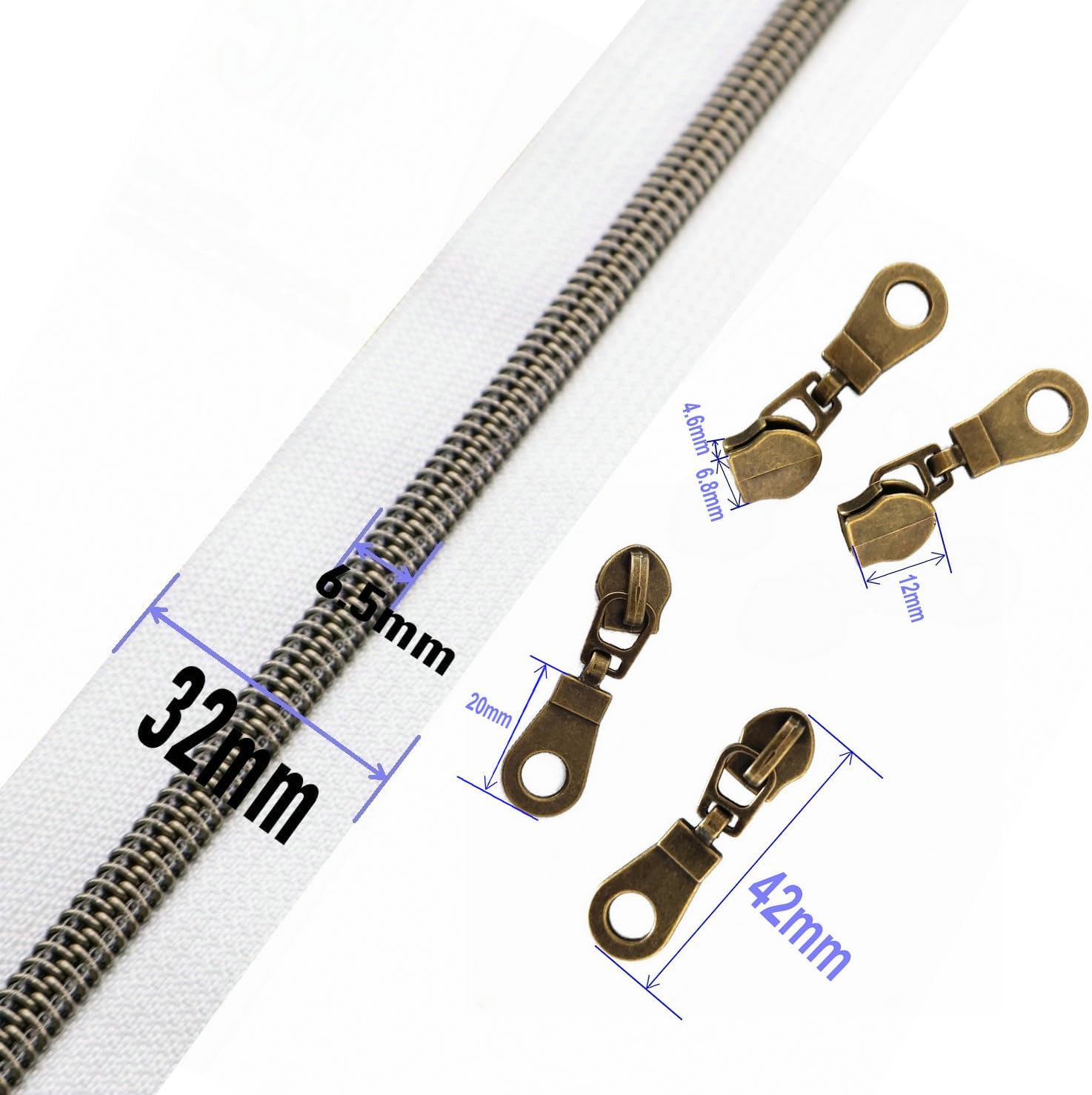 Leekayer #5 Antique Brass Metallic Nylon Coil Zippers by The Yard Bulk 10 Yards White Tape with 25pcs Antique Brass Sliders for DIY Sewing Tailor Craft Bag(White)
