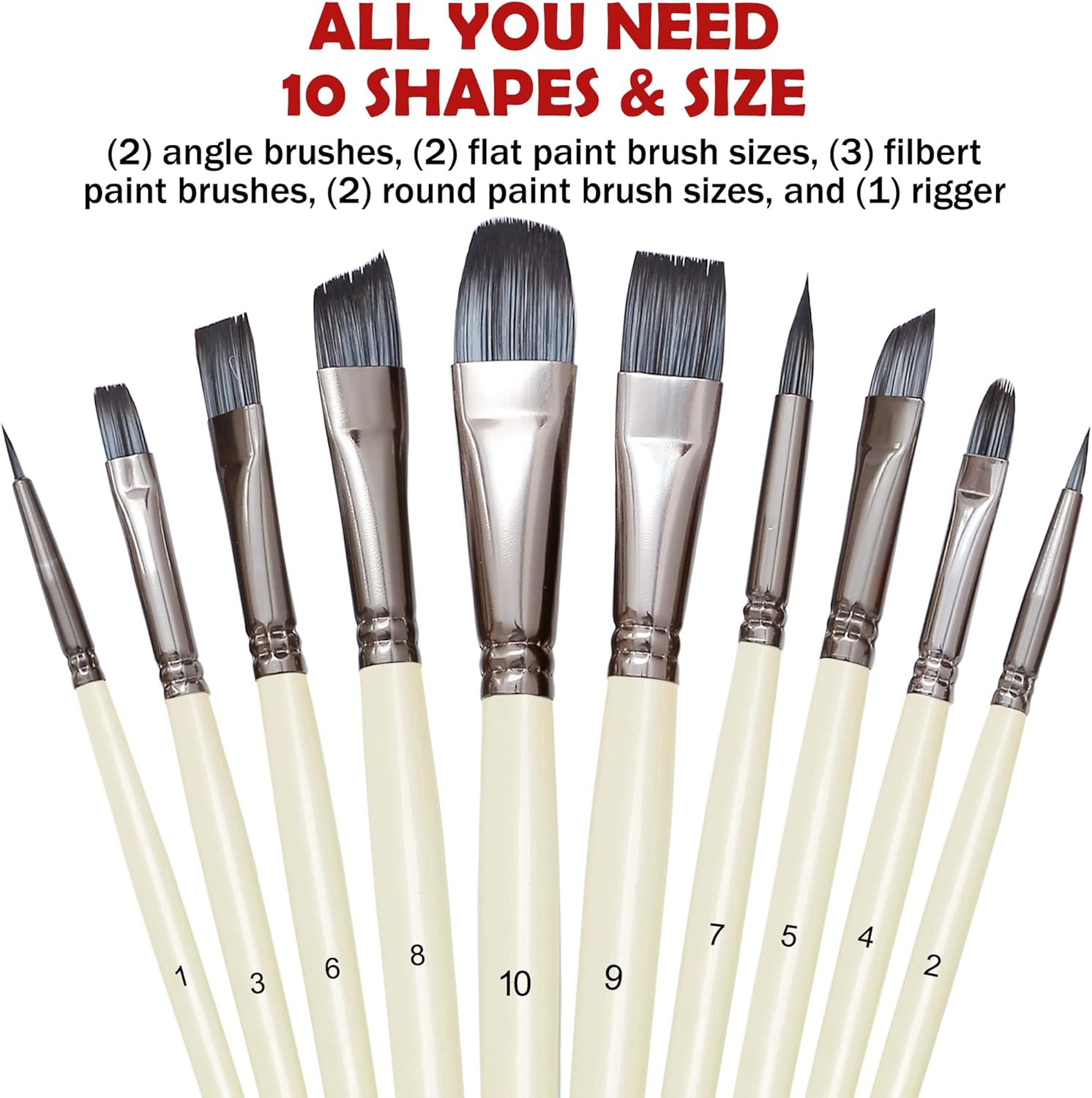 - Meets All Purpose Painting Needs: Set of 10 brushes in various sizes comes with (2) angle brushes, (2) flat paint brush sizes, (3) filbert paint brushes, (2) round paint brush sizes, and (1) rigger. These paint brushes are ideal for watercolor, oil, acrylic, gouaches, tempera painting, body-face painting and paint-by-numbers for adults.