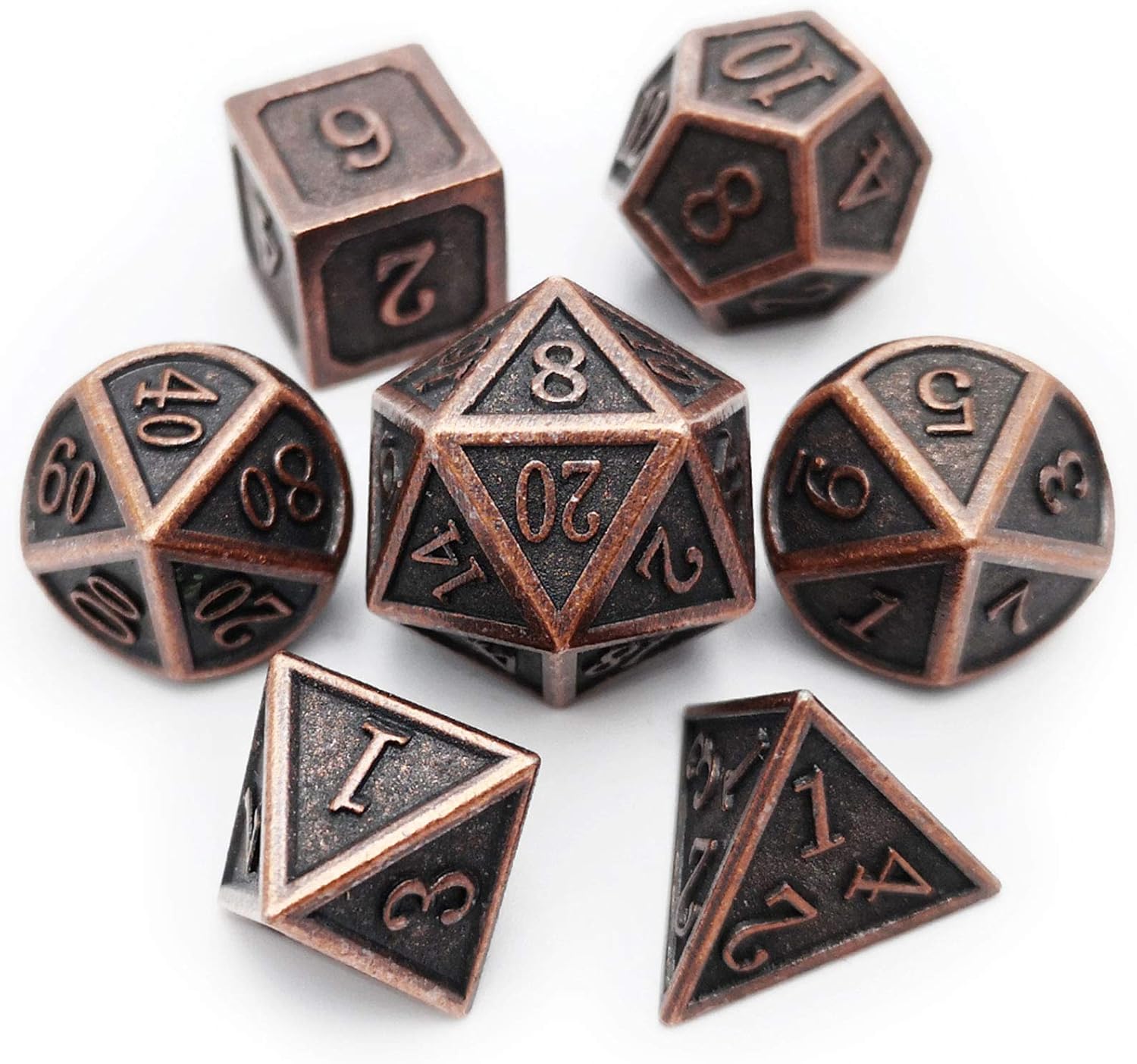 - Blacksmith Craft Copper Metal Dice Set: 7PCS Dice: D20, D12, D10, D%, D8, D6, D4