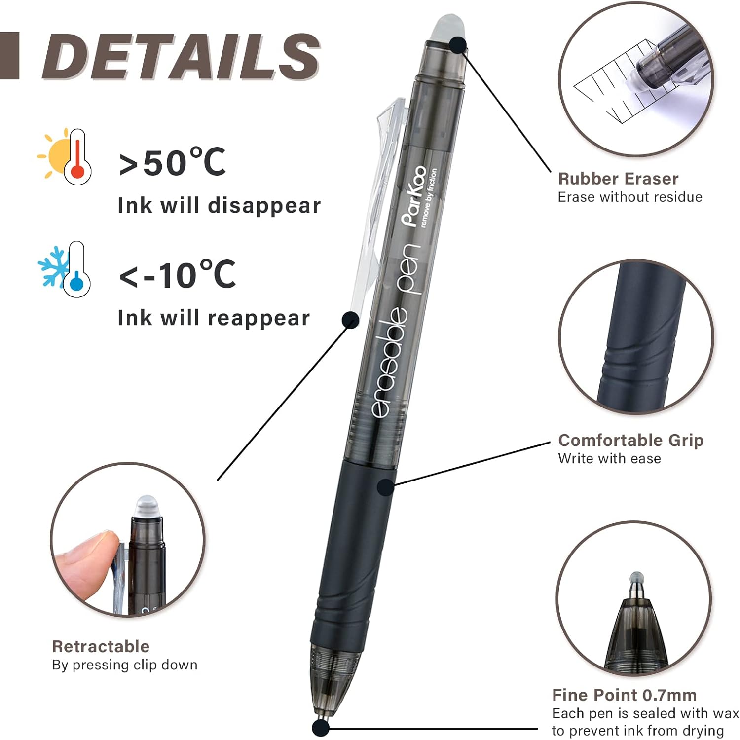 - No Mistake Writing: ParKoo friction erasable pens let you enjoy smooth writing while leave no room for error; Write, erase and rewrite without damaging documents; These gel pens set works great for creative projects