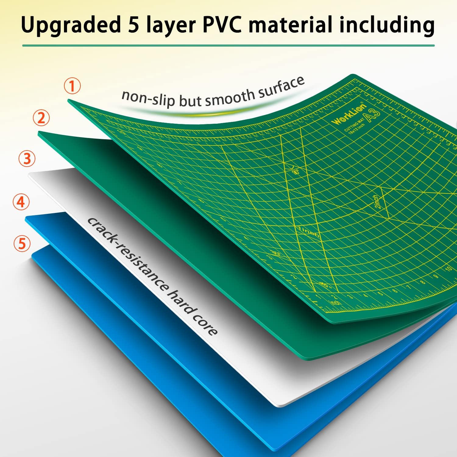 - 5-layer PVC material, White hardness PVC in the middle, Prevent cutting through when power cut.Works well for the heavy duty cutting,compatible with rotary cutters and straight blades.Some brand cutting mat are black in the middle, which is not durable