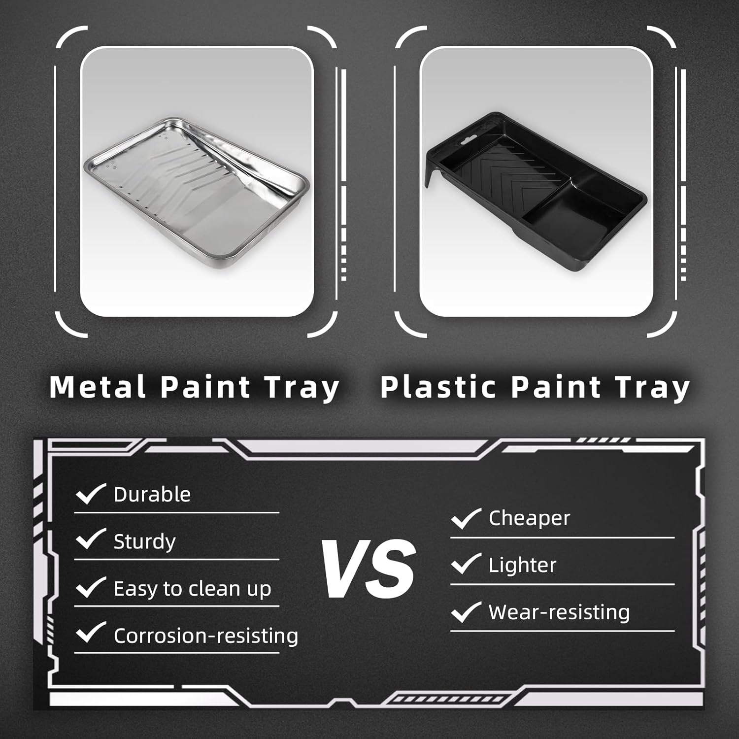 - Complete Painting Kit: This kit includes a Roller Tray with a disposable Liner, 2 Roller Frames (9"+4"), 4 Roller Covers (9"+4"), and a 2" Angle Brush. It provides all the essential tools you need to tackle various painting project applications.