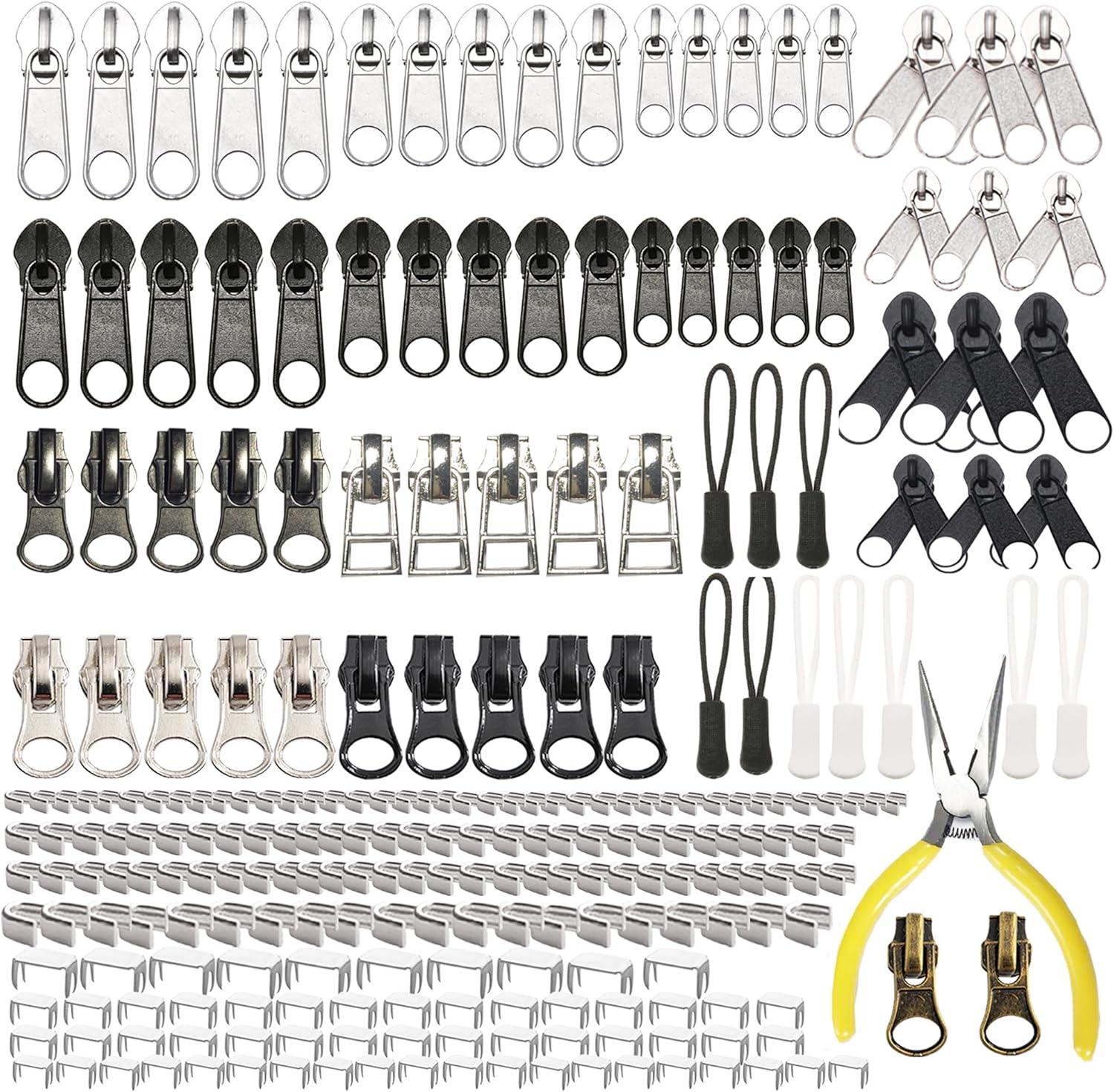 - zipper repair kit come with 255 pieces in total.30 pcs sliders for nylon coil zippers without lock(3# ,5#,8#),12pcs zipper slider for nylon coil zippers without lock((3# ,5#,)7pcs sliders with locking for metal zippers(5#),10pcs sliders with locking for nylon coil zippers(5#),5pcs sliders for plastic zippers(5#).10pcs black & white pulls,180pcs stops(3#,5#,8#),1 install plier and 1 instruction.