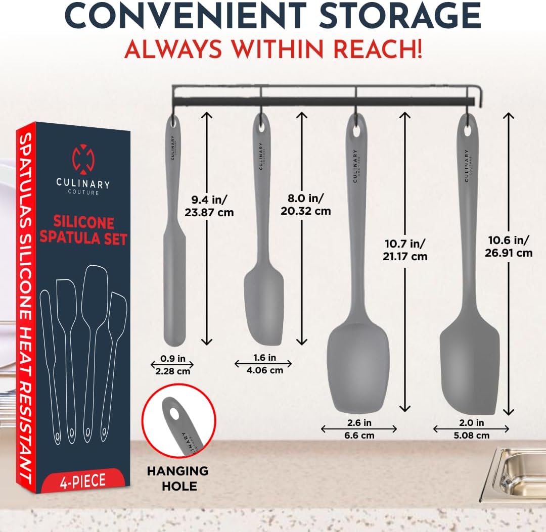 Culinary Couture 4-Piece Grey Baking Spatula Set - Rubber Spatulas Silicone Heat Resistant, BPA-Free - Spatula Set for Nonstick Cookware - Silicone Baking Utensils