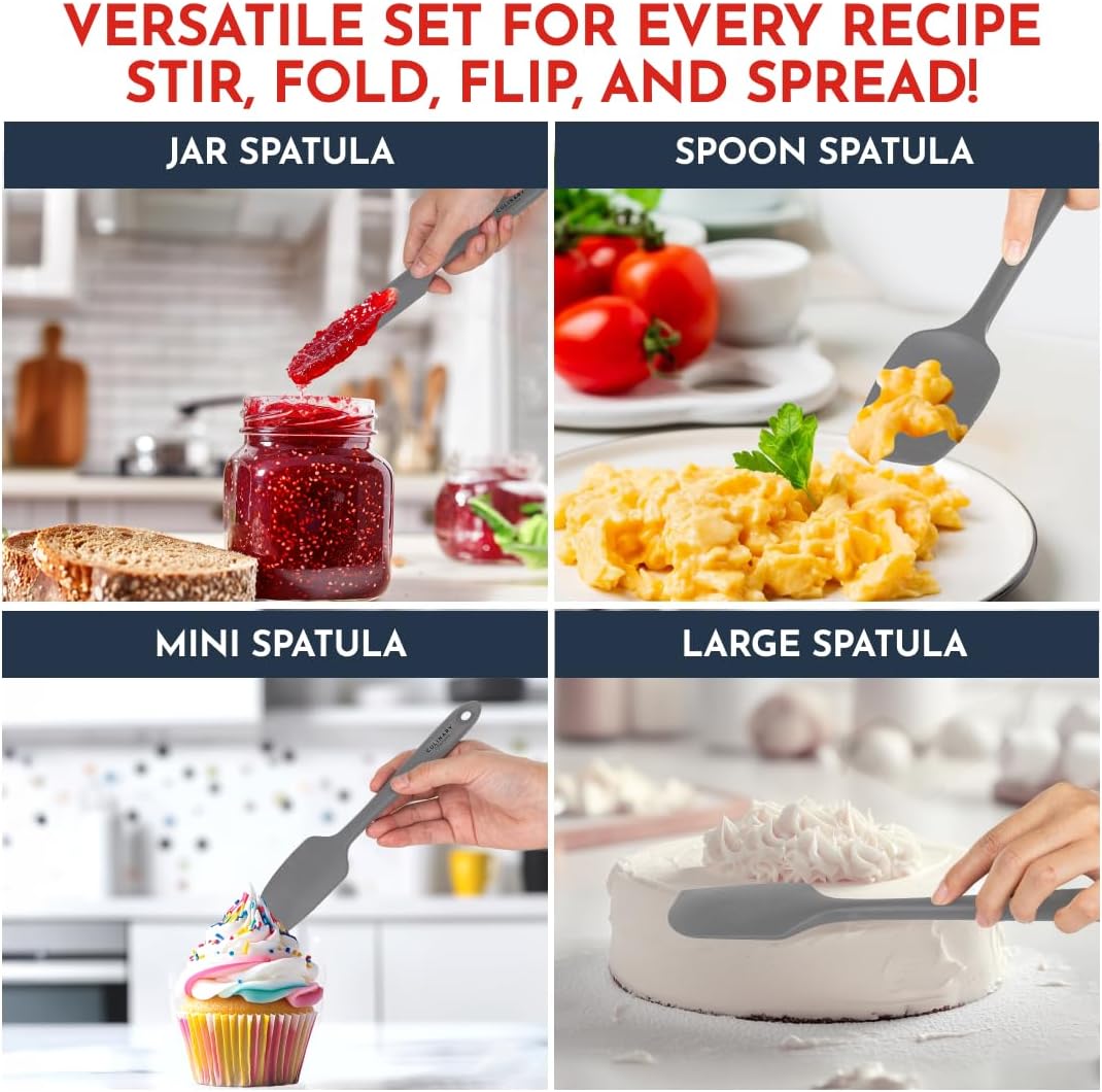 - Professional Set of Four—Mix, fold, frost, and scrape with our silicone spatula set! Each silicone baking set includes both large and small spatulas; a mini silicone spatula, jar spatula, spoon spatula and a large spatula for all your cooking and baking needs.