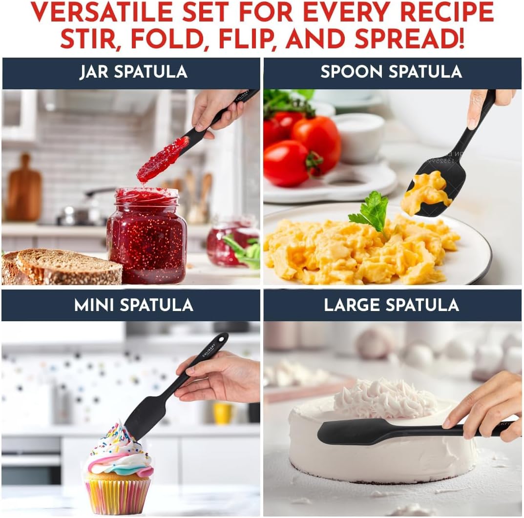 - Professional Set of Four—Mix, fold, frost, and scrape with our silicone spatula set! Each silicone baking set includes both large and small spatulas; a mini silicone spatula, jar spatula, spoon spatula and a large spatula for all your cooking and baking needs.