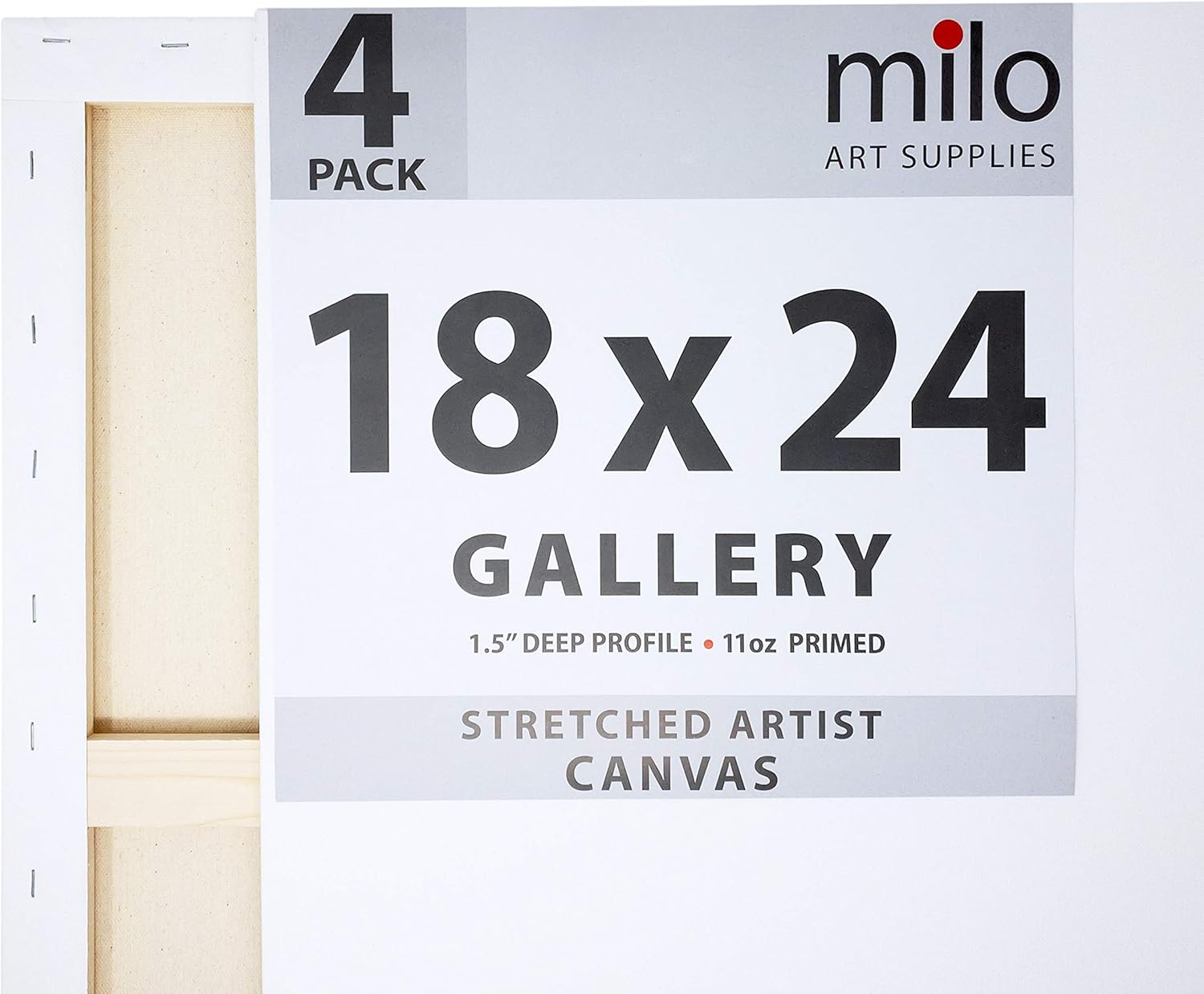 milo Stretched Artist Canvas | 18x24 inches | 4 Pack | 1.5” inch Thick Gallery Profile | 11 oz Primed Large Canvases for Painting, Ready to Paint Art Supplies for Acrylic, Oil