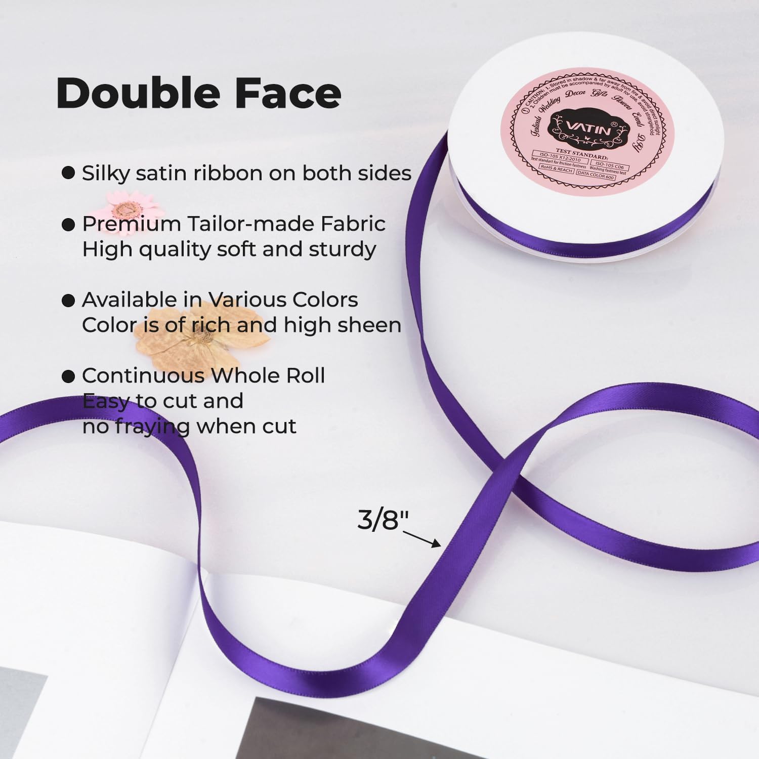 VATIN Double Face Bright Purple Satin Ribbon 3/8" Continuous 50 Yards,Purple Polyester Fabric Ribbon use for Bows Bouquet, Gift Wrapping, Floral Arrangement Wedding Decoration