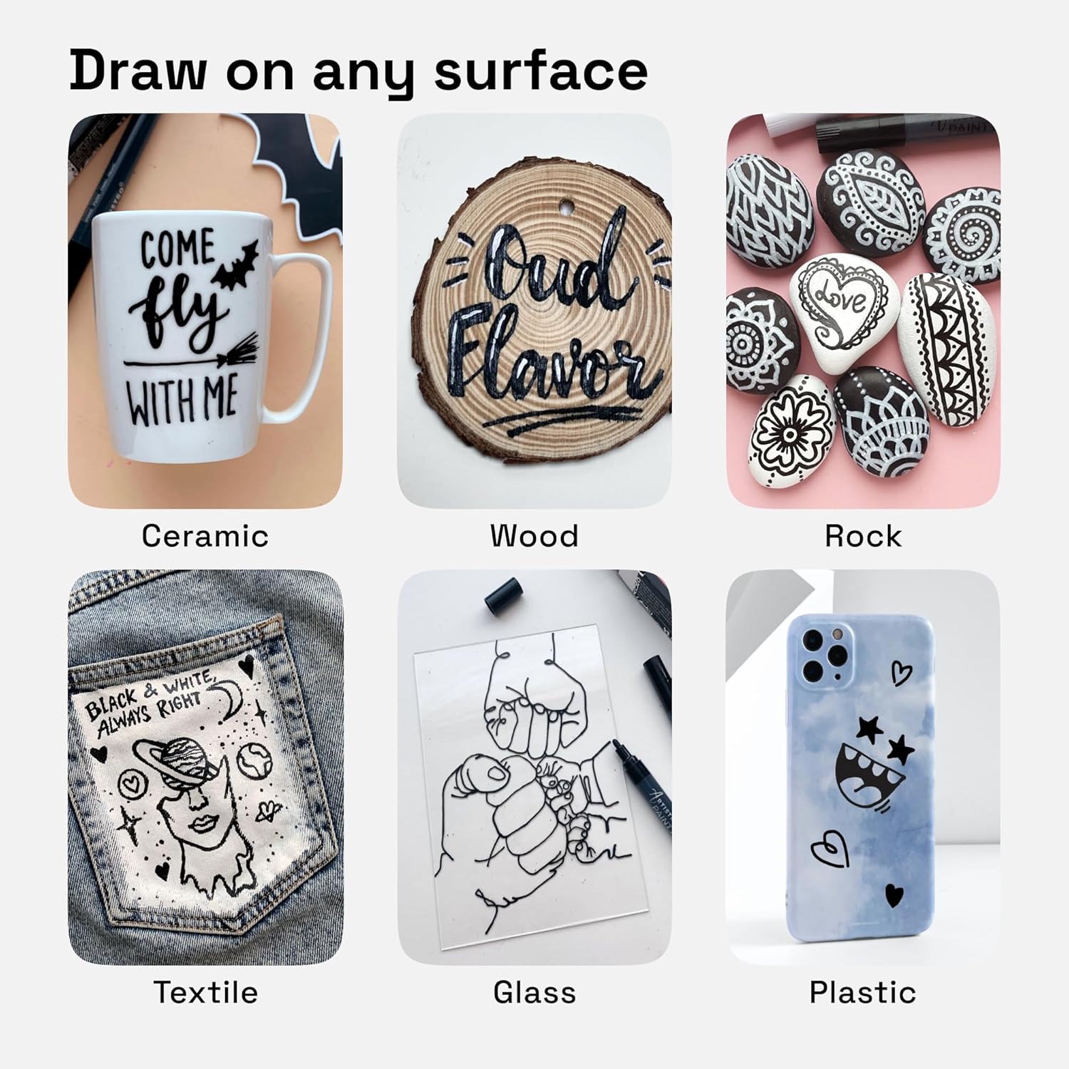 - Great for All Surfaces: Use these black paint pens as fabric markers, metallic chalk pens, or pens for glass. Black markers paint is good on almost all surfaces, like paper, rocks, stone, plastic, metal, wood, and more.